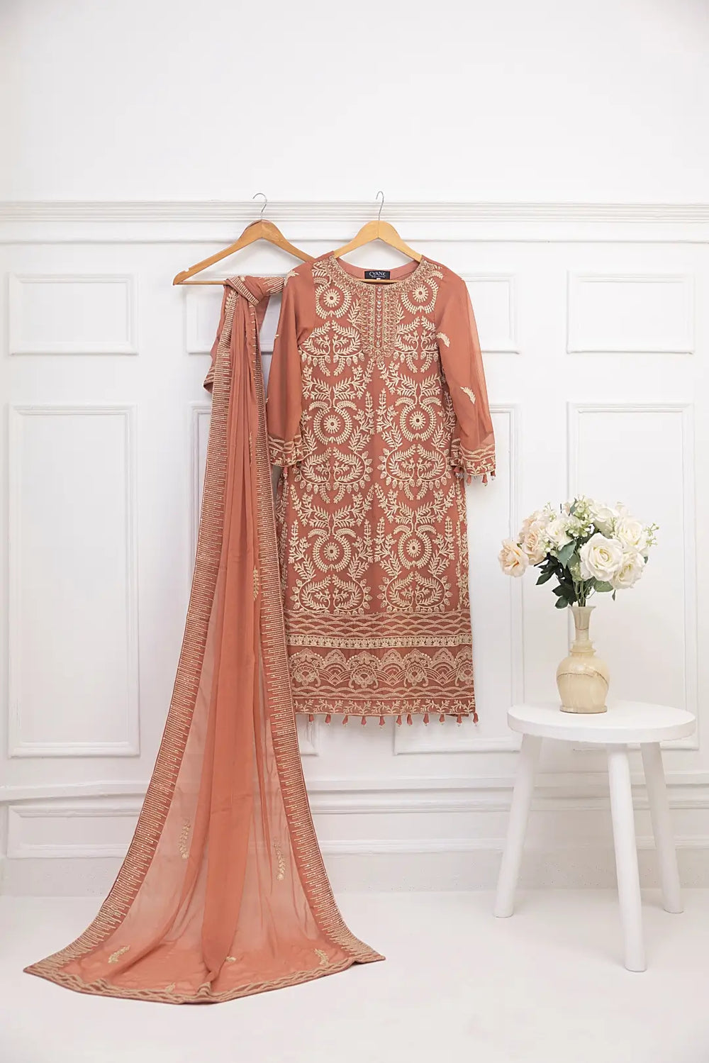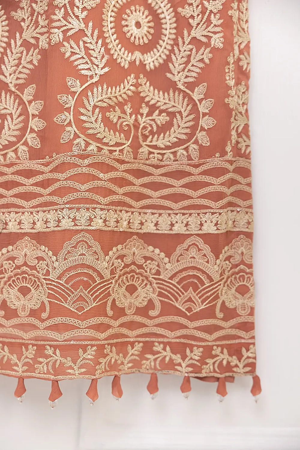This stitched shirt and dupatta set features exquisite thread and sequin work across the chiffon, creating a luminous, elegant appeal. The neckline is enhanced with hand embellishments of kora and dabka, accented with pearls for a luxurious touch. Detailed pearl and fabric accents on the shirt.