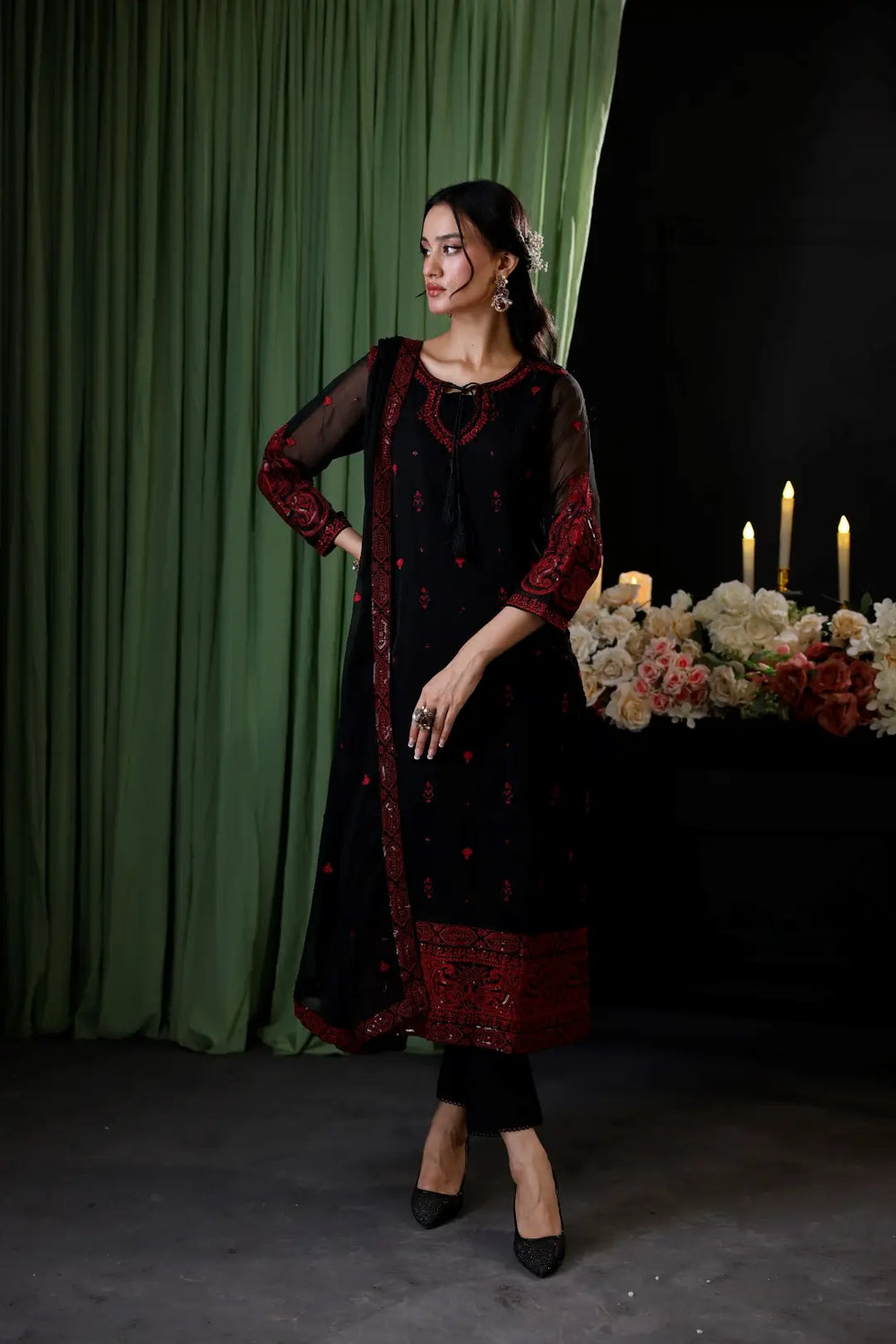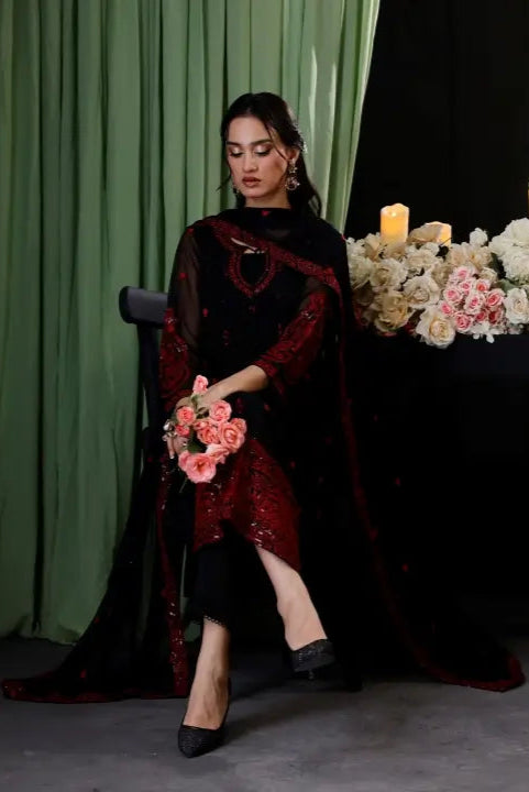 This beautiful outfit features a sequin-embroidered chiffon A-line shirt. The detailed design includes sequin-embroidered borders on the front and back, as well as a beautifully crafted neckline patch with dori and a heavy bunch and border on the sleeves.
