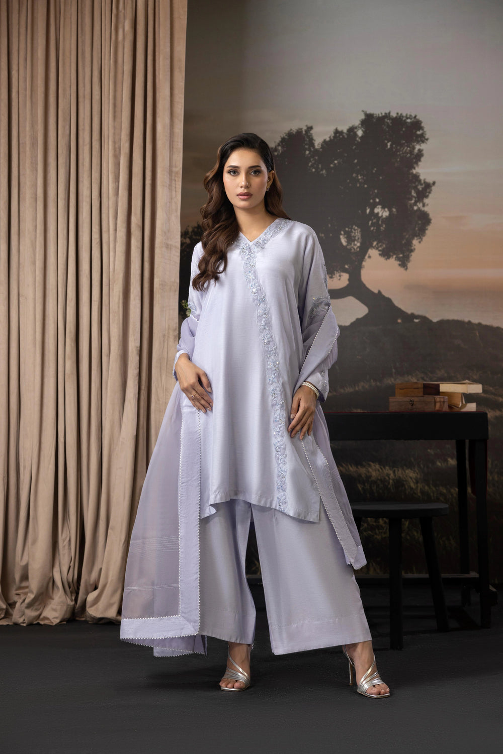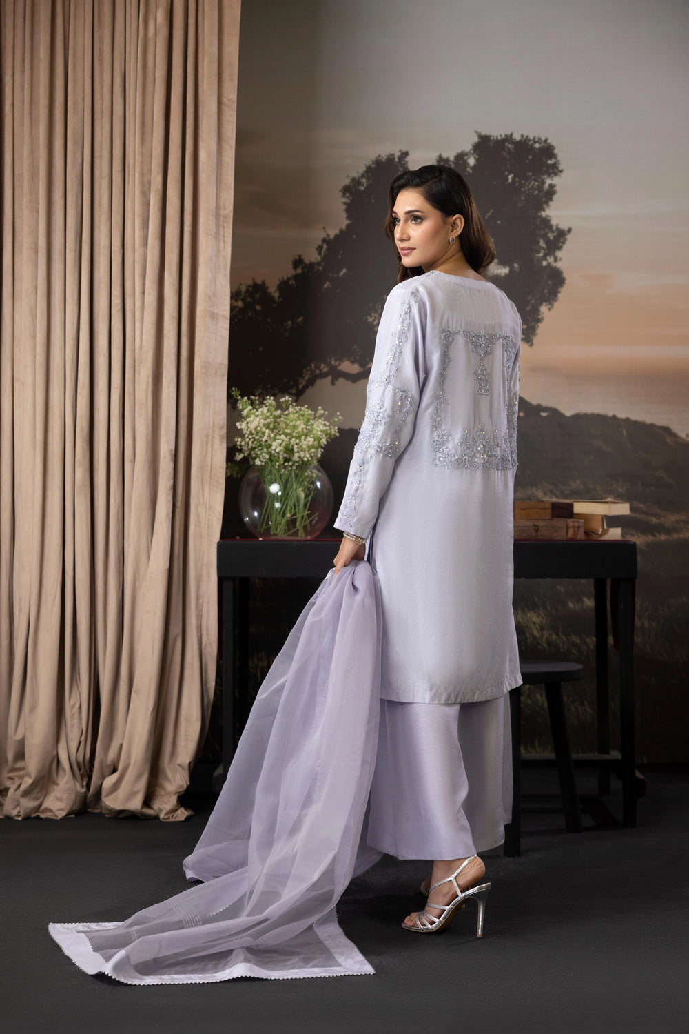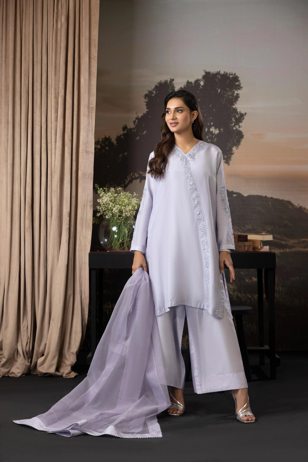 A refined 3-piece raw silk outfit paired with an organza dupatta — combining elegant embroidery and timeless silhouette for a sophisticated festive look.