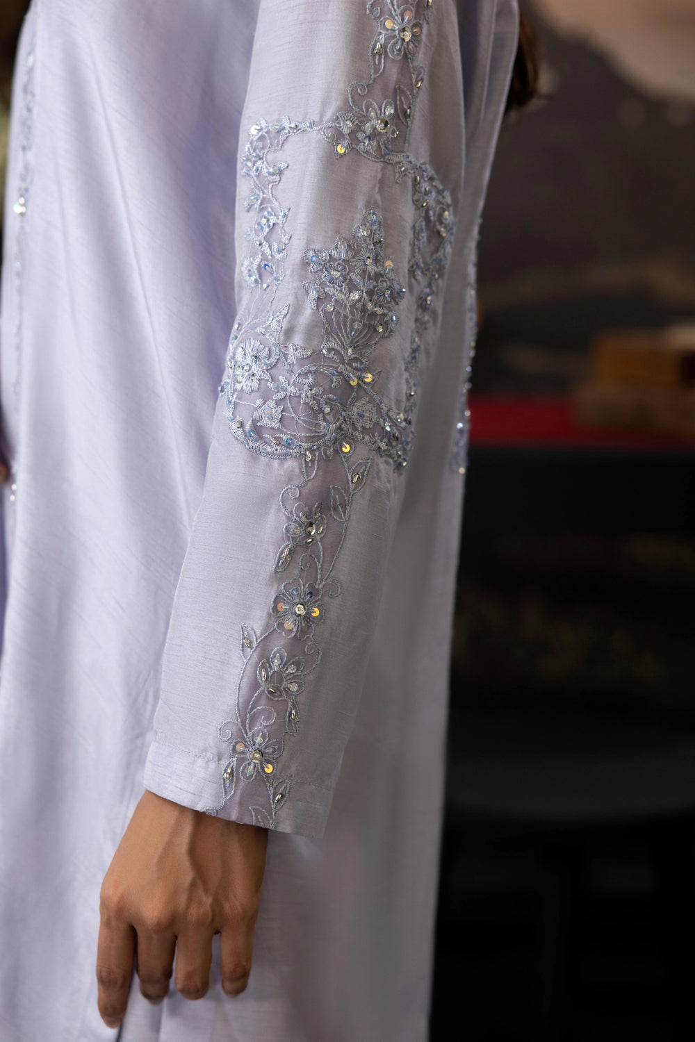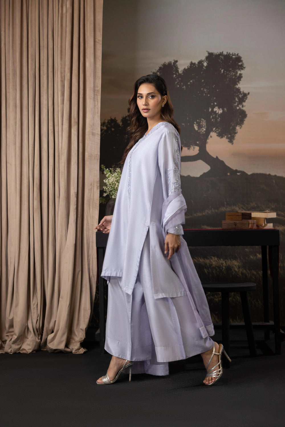 Crafted from raw silk, this mid-length shirt features machine embroidery with hand touching work, an A-line daman, and a V-neckline with asymmetrical embroidery along the hem. Paired with culotte pants and an organza dupatta detailed with lace and zari along the paltawa for a graceful finish.