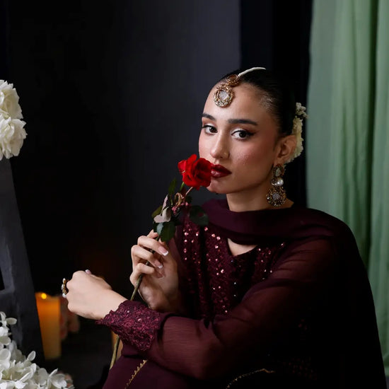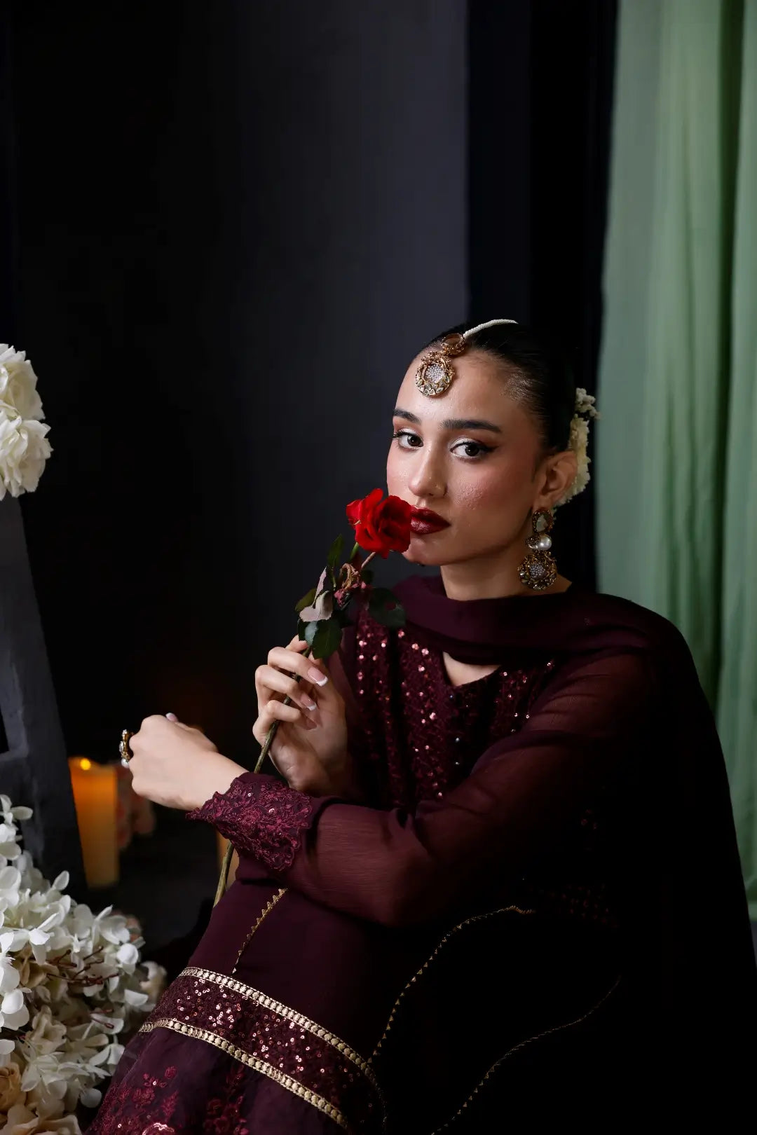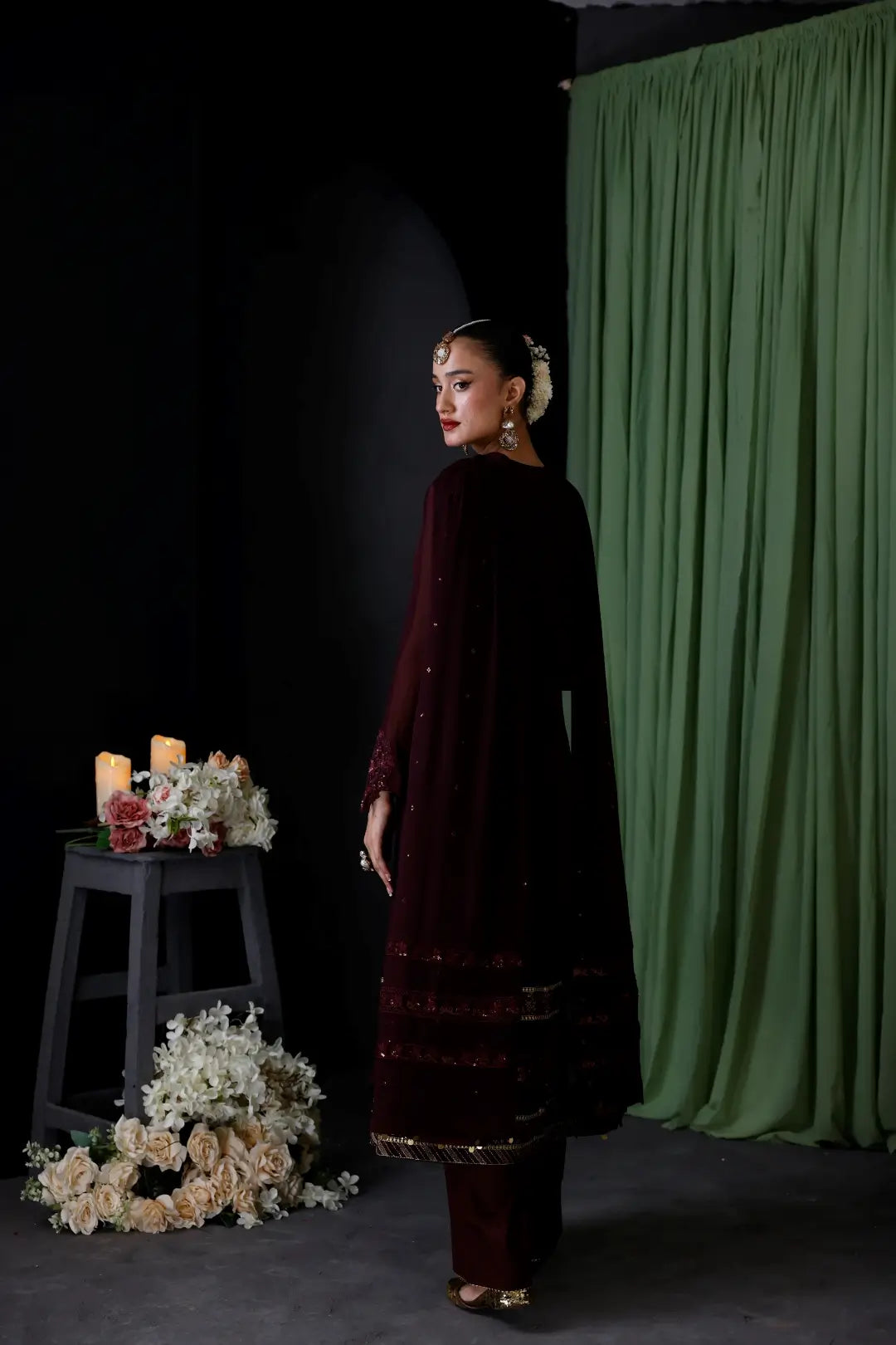 The flowing Anarkali silhouette features all-over sequins embroidery that shimmers beautifully with every movement. Delicate lace detailing runs along the front panels, while the heavy daman borders on both front and back — crafted with sequin and zari work on organza — add a luxuriously defined finish. Straight sleeves are adorned with embroidered bunches for a subtle yet polished look, while a buttoned neck slit adds an element of understated charm. The dupatta is equally captivating, featuring embroidered pallus with sequin hangings on both sides. Paired with lace-accented pants, the outfit strikes the perfect balance between traditional allure and contemporary refinement.