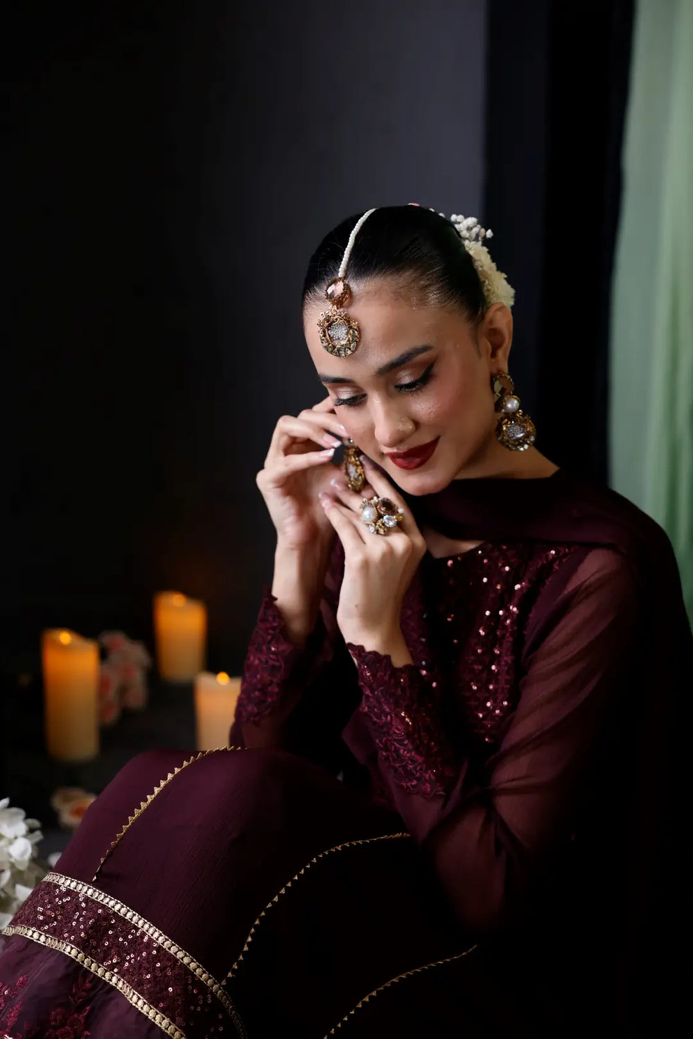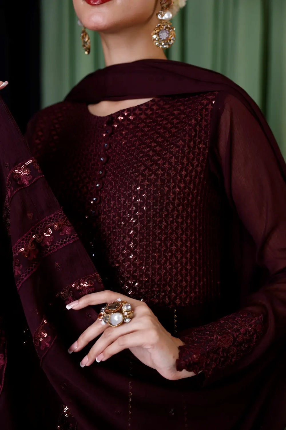 Style this outfit with heavy traditional jhumkas and gold khussas for a truly regal look. Complete the ensemble with a sleek bun to exude timeless elegance.