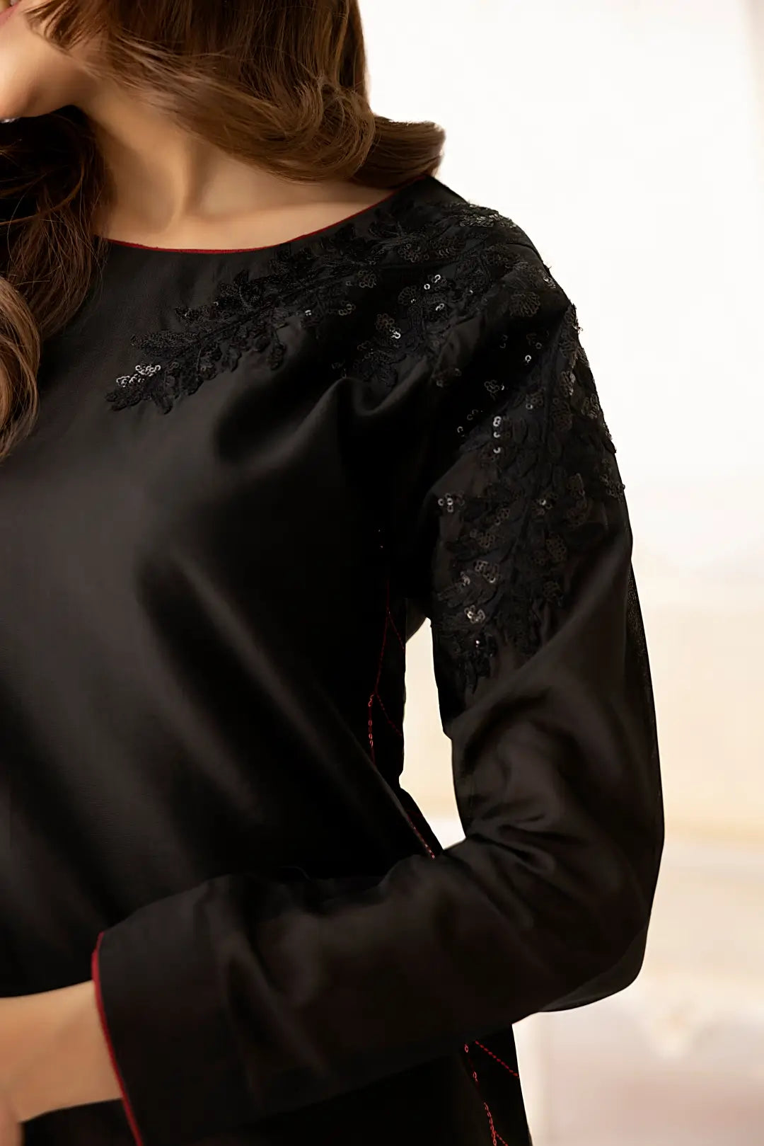 This elegant black shirt showcases black sequin embroidery on the shoulders and sleeves, with subtle red sequin detailing along the sides for a bold contrast on premium sheesha silk fabric. It’s paired with matching culottes for a chic and refined look, while the straight-fitted sleeves add a classic touch.