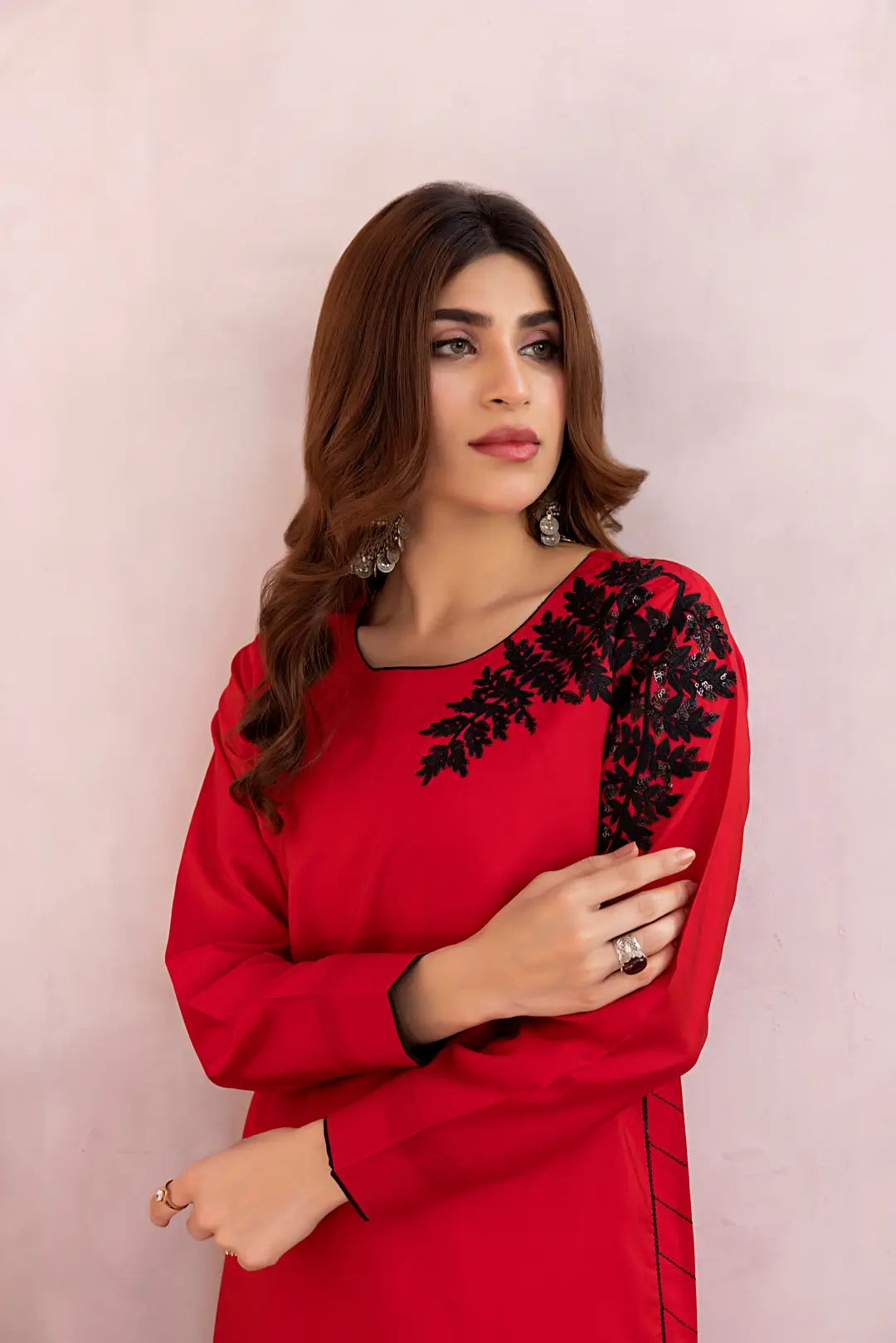 This elegant pink long shirt on sheesha silk showcases black sequin embroidery on the shoulders and sleeves, with subtle black sequin detailing along the sides for a bold contrast. It’s paired with matching boot-cut pants for a chic and refined look, while the straight-fitted sleeves add a classic touch.