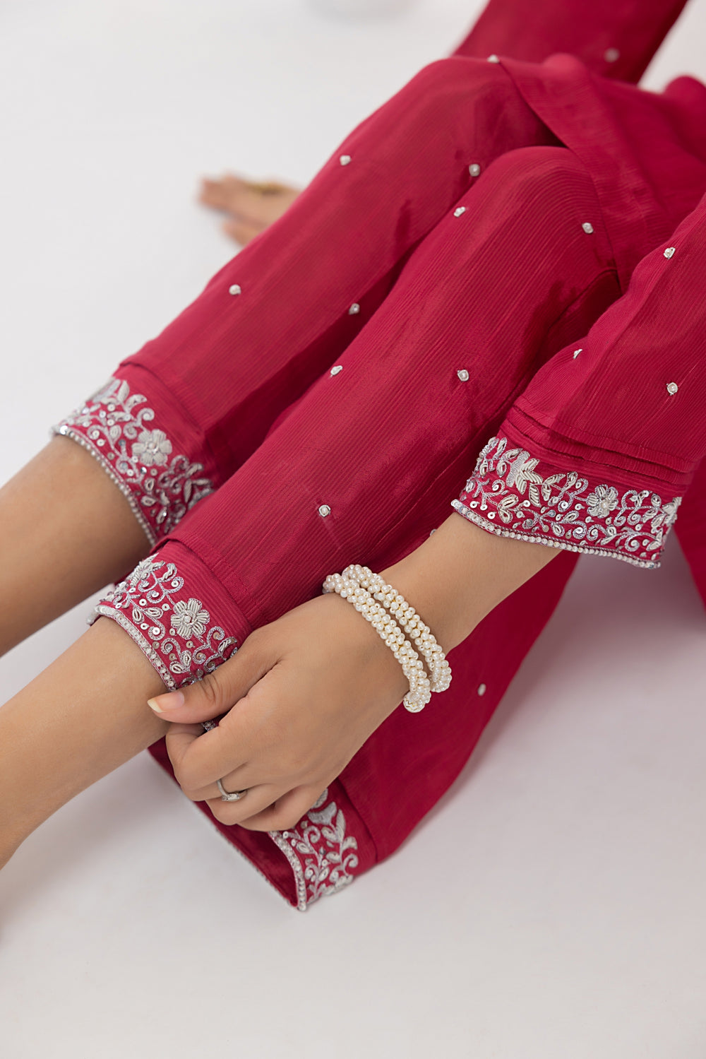 "Fuchsia" is a captivating ensemble in a striking hot pink hue, crafted from raw silk. The short shirt design exudes a modern and chic vibe, while the hand embroidery of Kora Dabka, Naqshi, sequences adds exquisite detail. The box trouser complements the ensemble with hand-embellished accents, completing the look with style and elegance. "Fuchsia" is a celebration of color and energy, perfect for those who desire a bold and confident fashion statement.