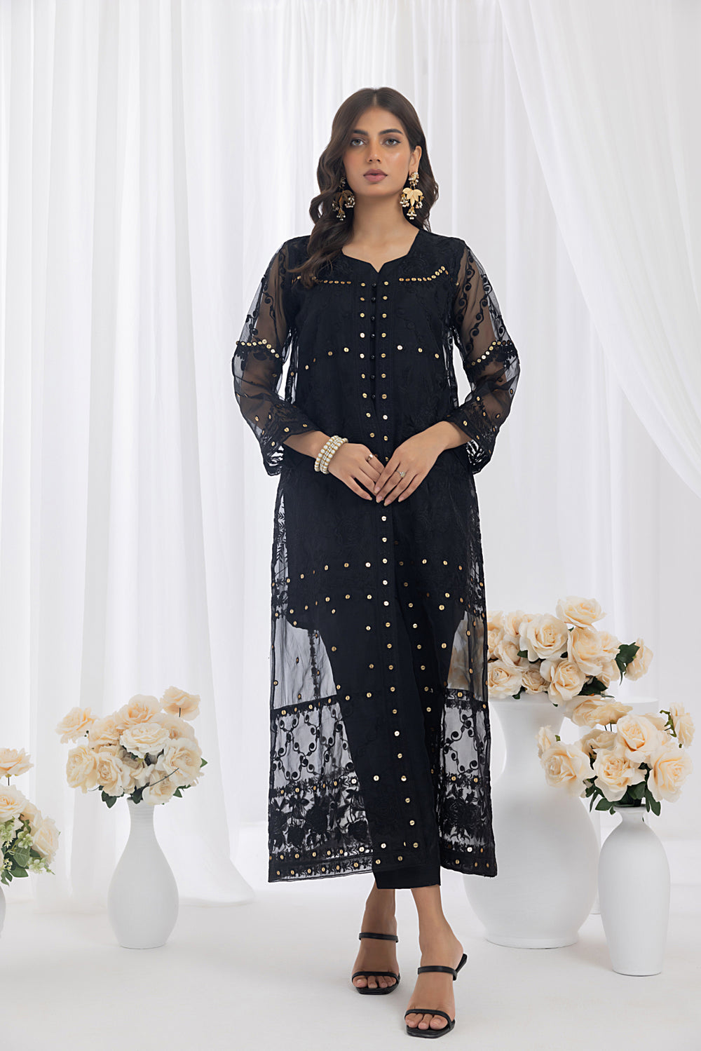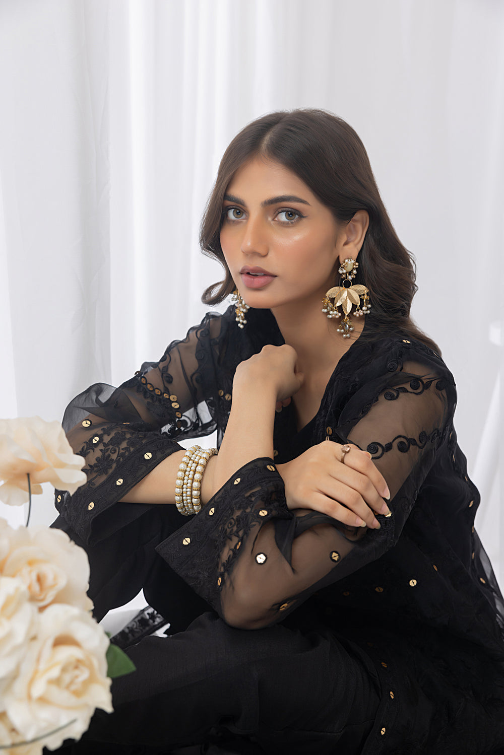 "Galaxia" is an alluring ensemble that captures the essence of darkness and mystery. The Organza coat adorned with Embroidered Gold sequins creates a celestial display of glimmering stars against the black backdrop. The silk inner and trousers provide a luxurious touch. With its unique combination of textures and the play of light. Step into the night with "Galaxia" and embrace the allure of the shadows.
