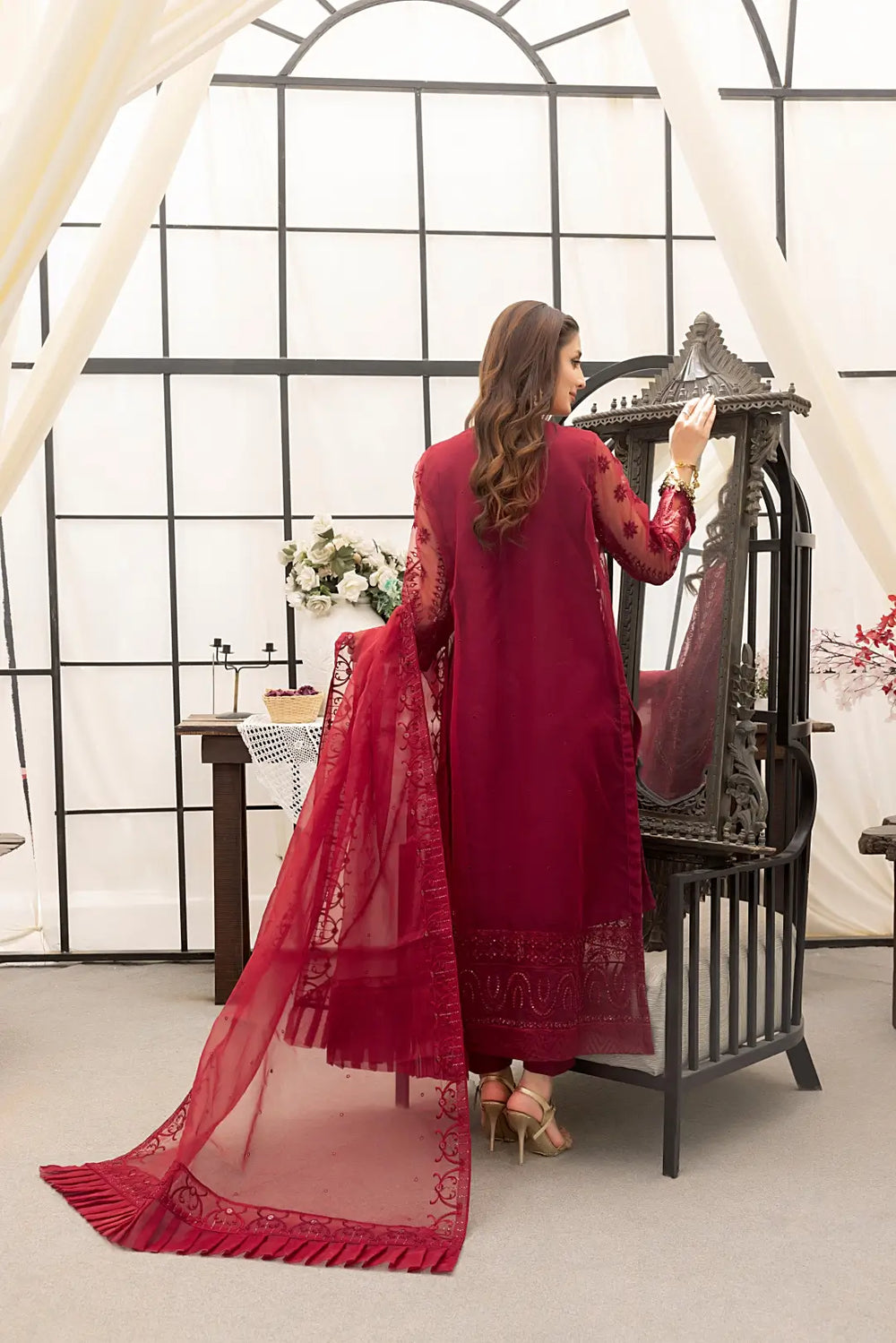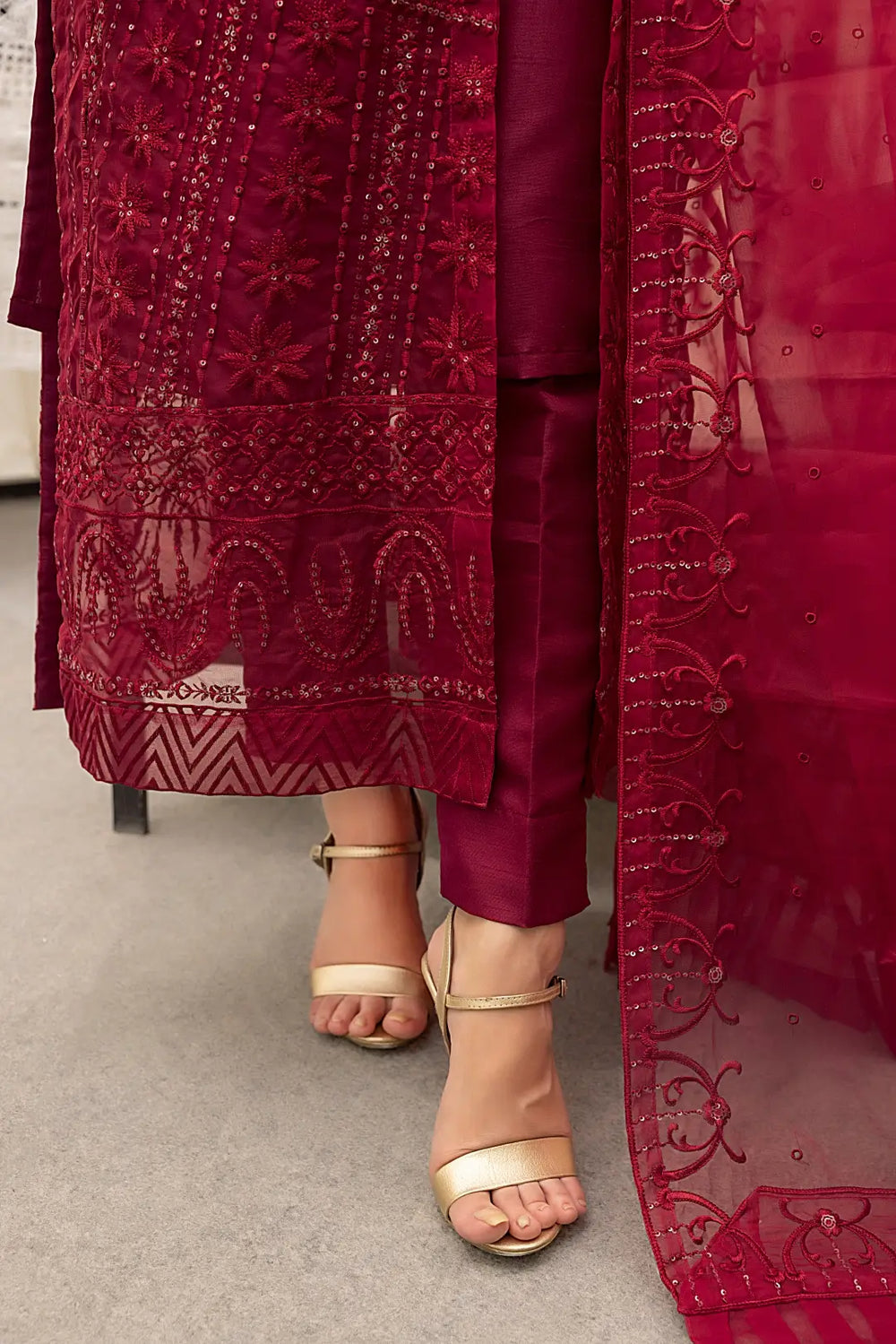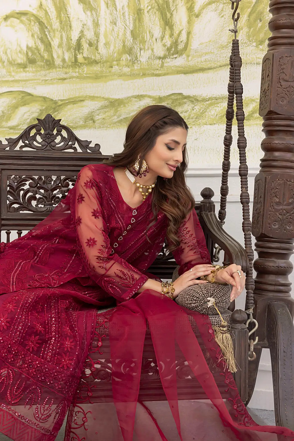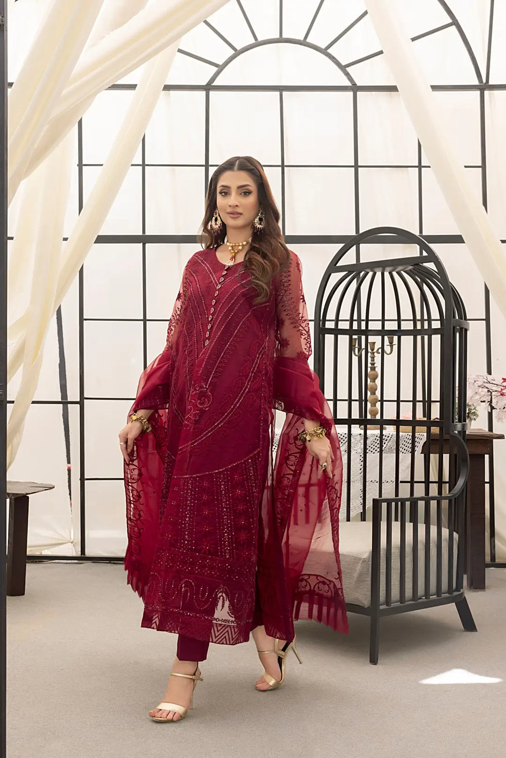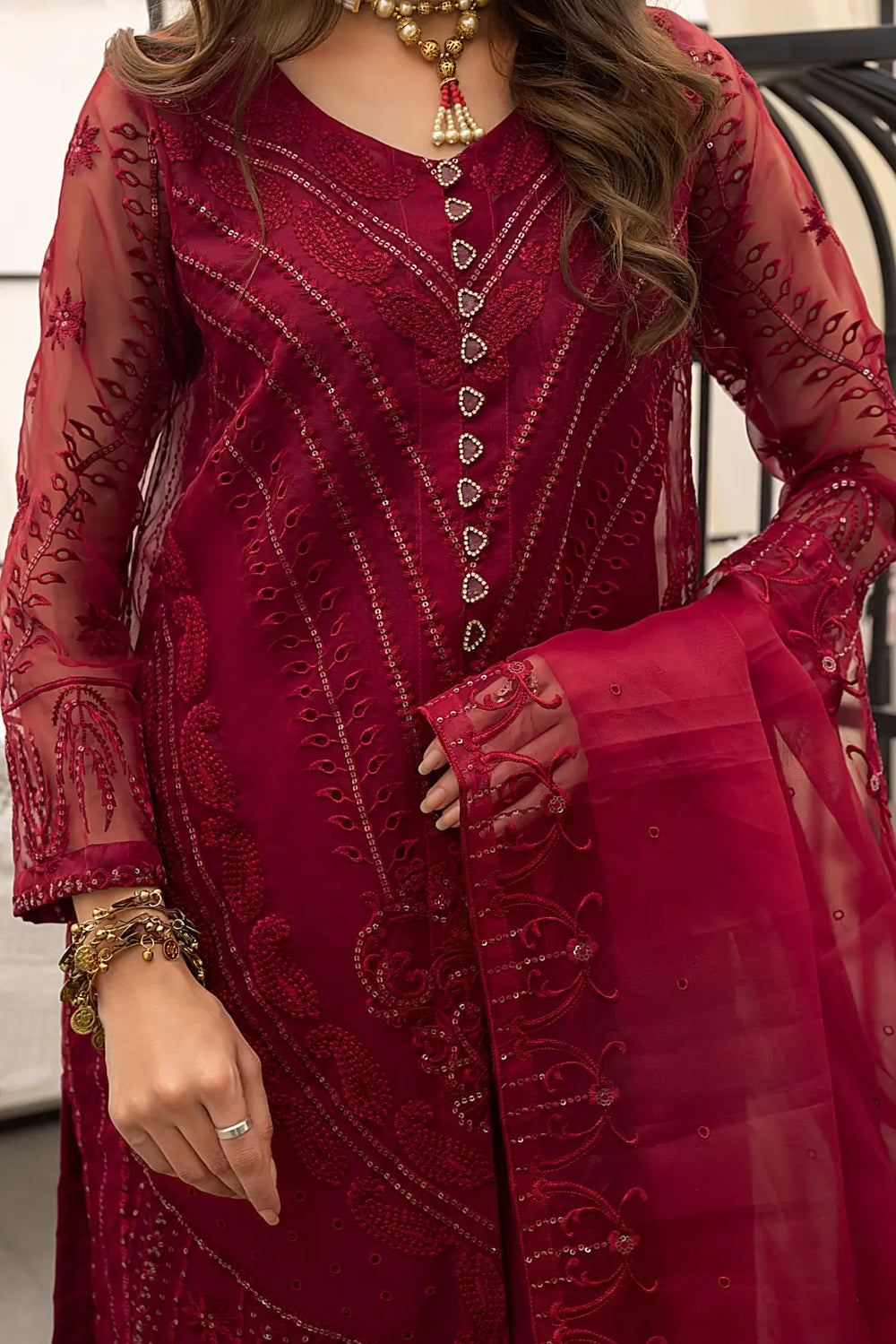This ensemble features a long organza shirt enriched with all-over sequin embroidery on the front, back, and sleeves for a sparkling yet refined finish. Hand-embellished buttons trace the neckline, adding a bespoke touch. To elevate the movement, the dupatta is adorned with embroidered borders and finished with delicate organza frills.
