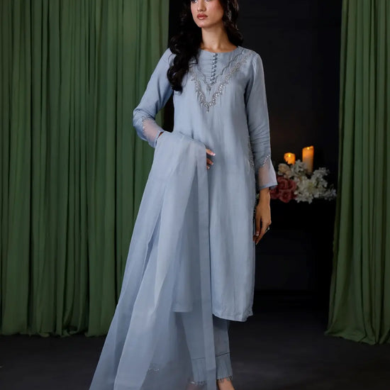 The raw silk shirt features delicate hand-embroidered embellishments along the neckline and sleeves, while graceful hand-embroidered bunches on the sides add subtle charm. The organza dupatta, finished with a shimmering sequin-embroidered border, brings a soft, graceful touch. Completing the look, sleek raw silk trousers with loop styling introduce a modern edge to the classic silhouette.