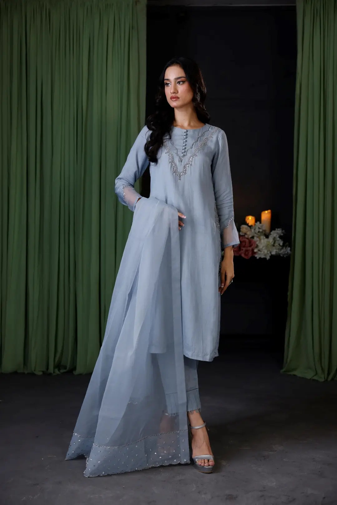 - Dupatta: Sequin-embroidered organza with border finishing