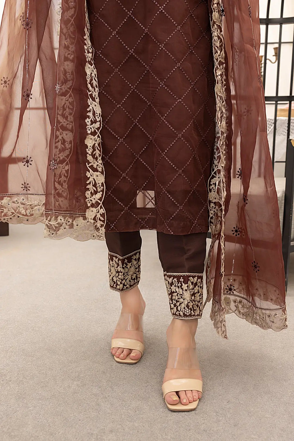 This stitched set features a beautifully tailored organza shirt adorned with sequin-embroidered front and back, finished with an elegant neck patch and chawk lace for intricate definition. The raw silk trousers, embellished with fine embroidery and bordered detailing, add structure and refinement.