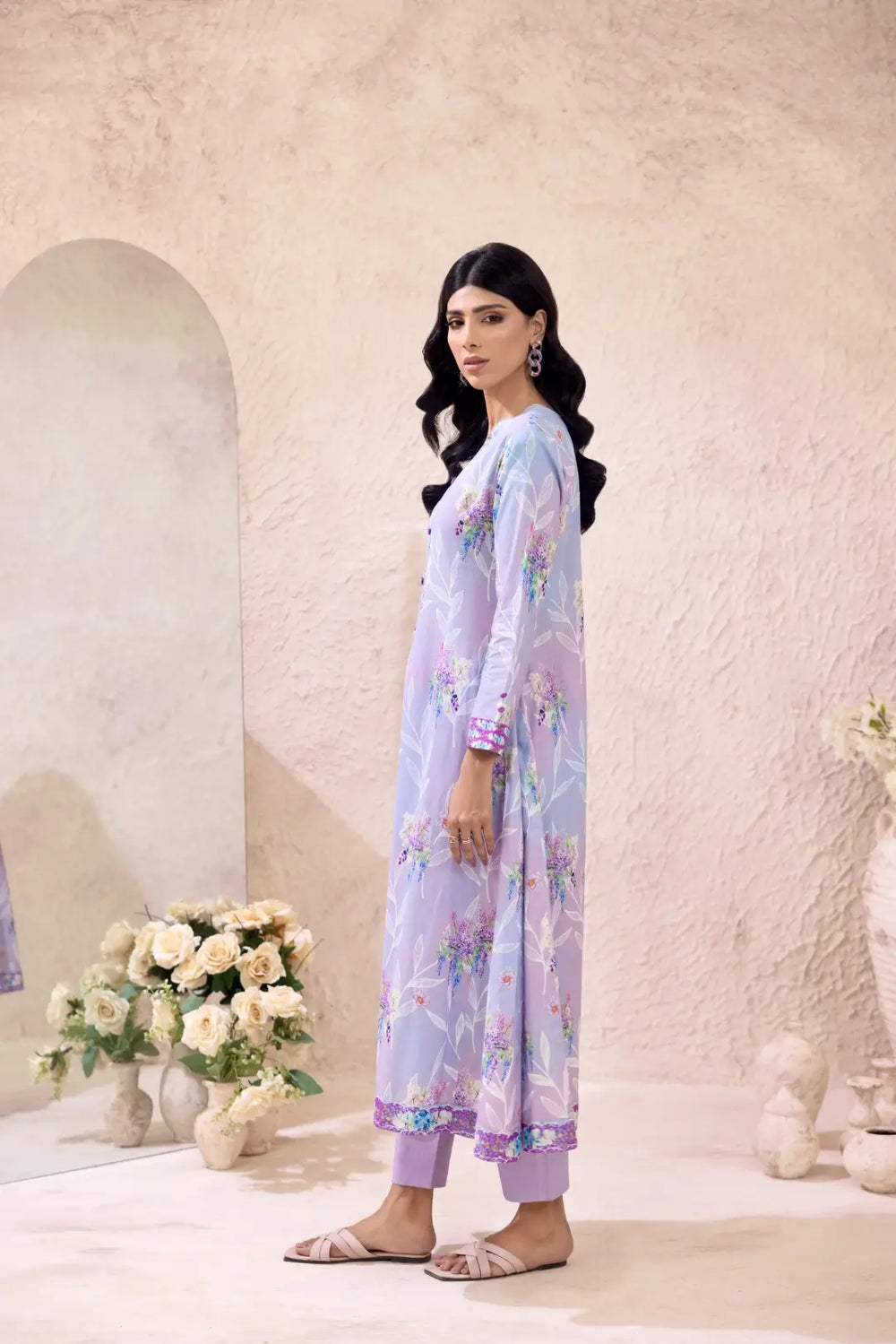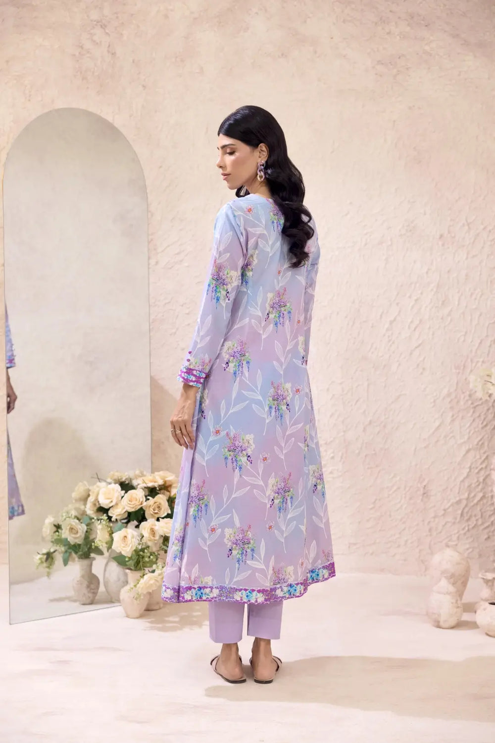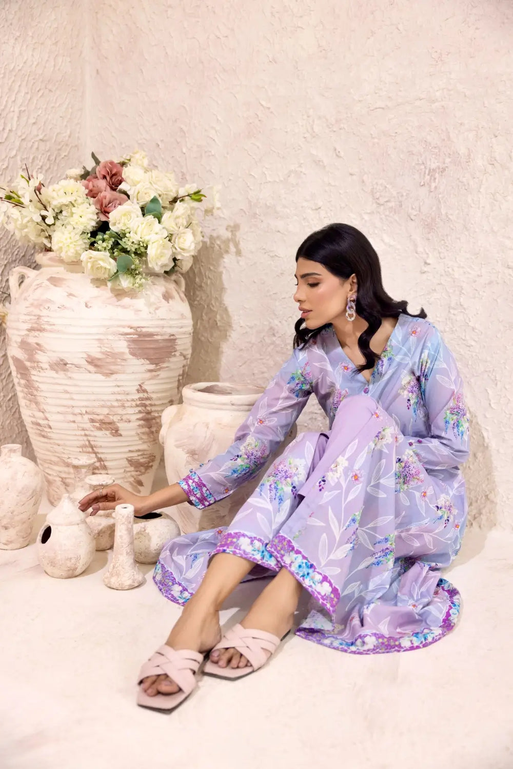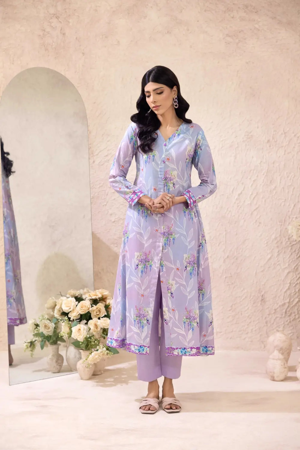 A full-length printed cambric shirt with structured panels and tailored back darts offers a sleek, body-fit silhouette. A V-neckline with button accents adds refinement, while fitted buttoned sleeves elevate the look. Chalks allow easy movement, and straight trousers finish this lilac-toned blend of classic tailoring and modern elegance.