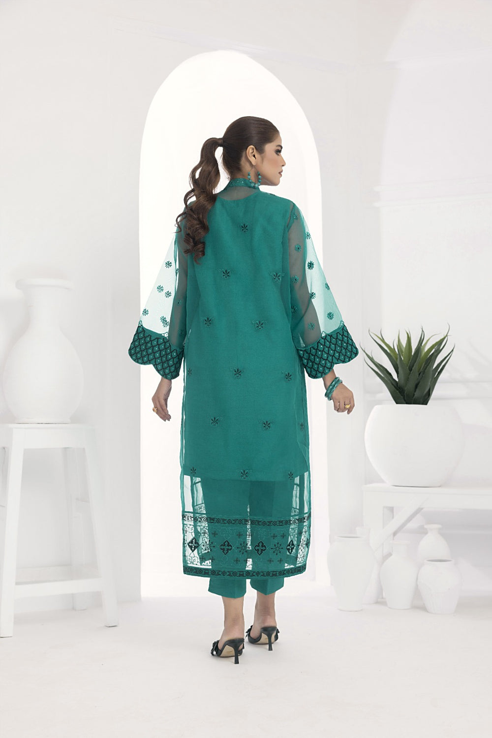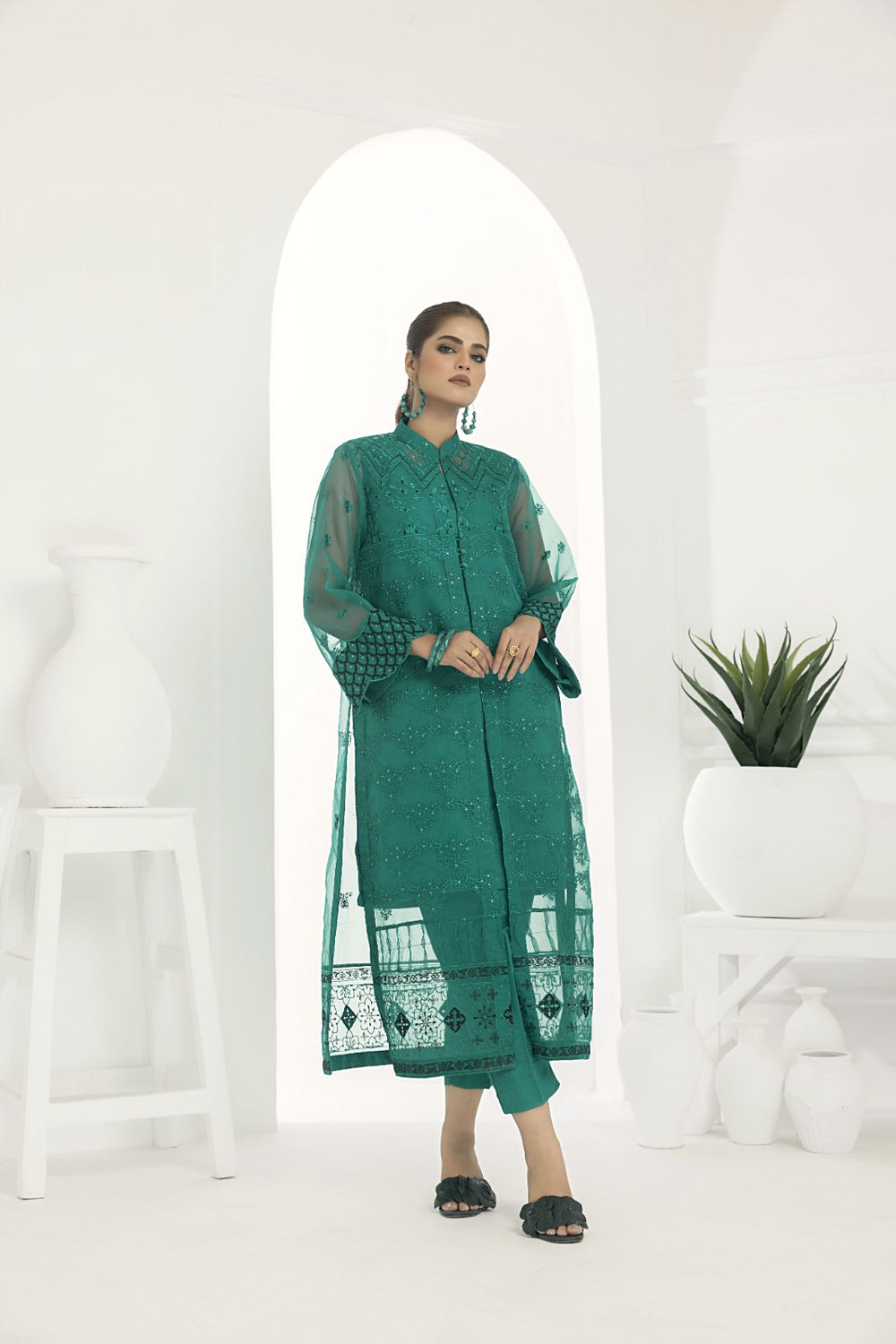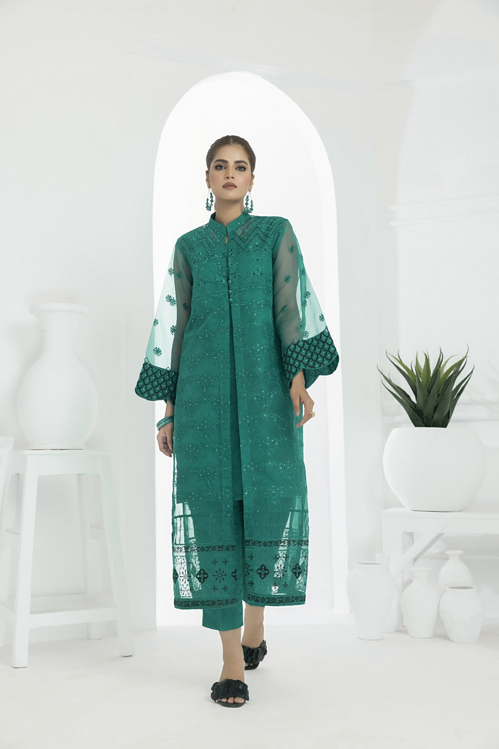 This gorgeous Coat Style Organza Shirt Paired with Raw Silk Inner and Trouse is the most reliable fashion choice this festive season. The dress is beautifully crafted with sequins embroidery and concentrated detailing adding a touch of luxury and sophistication by making it stand out as a perfect dress for Eid.