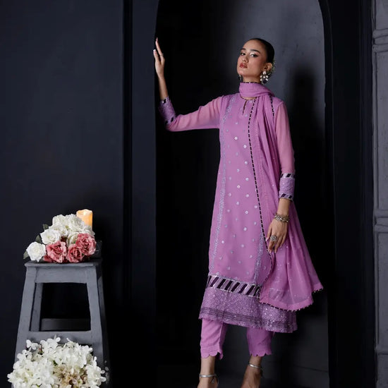 Turn heads with this opulent ensemble, a perfect blend of tradition and contemporary elegance. The heavy daman border takes center stage with intricate thread and sequin embroidery, accentuated by silver sequins that shimmer with every step. Seamlessly complemented by fitted sleeves embellished with delicate patterns and lace detailing. The boat neckline, outlined with exquisite gotta, adds a refined charm, while the dupatta—featuring all-over sequin work and a gotta border on all four sides—completes the look with undeniable grace. This outfit is a masterpiece designed for those who seek sophistication and grandeur in every detail.