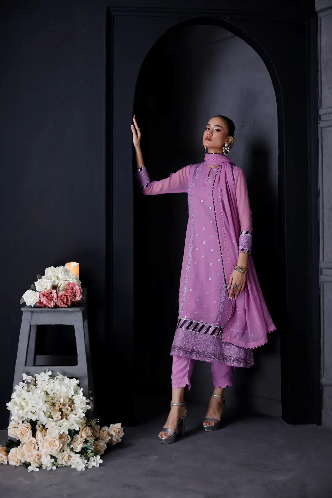 - Bottom: Coordinated pants with elegant cut work for a refined finish