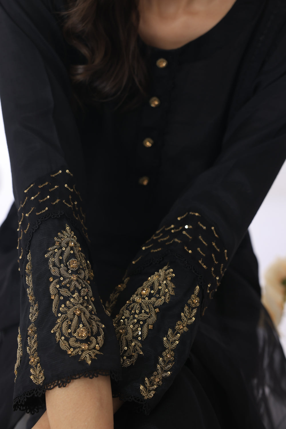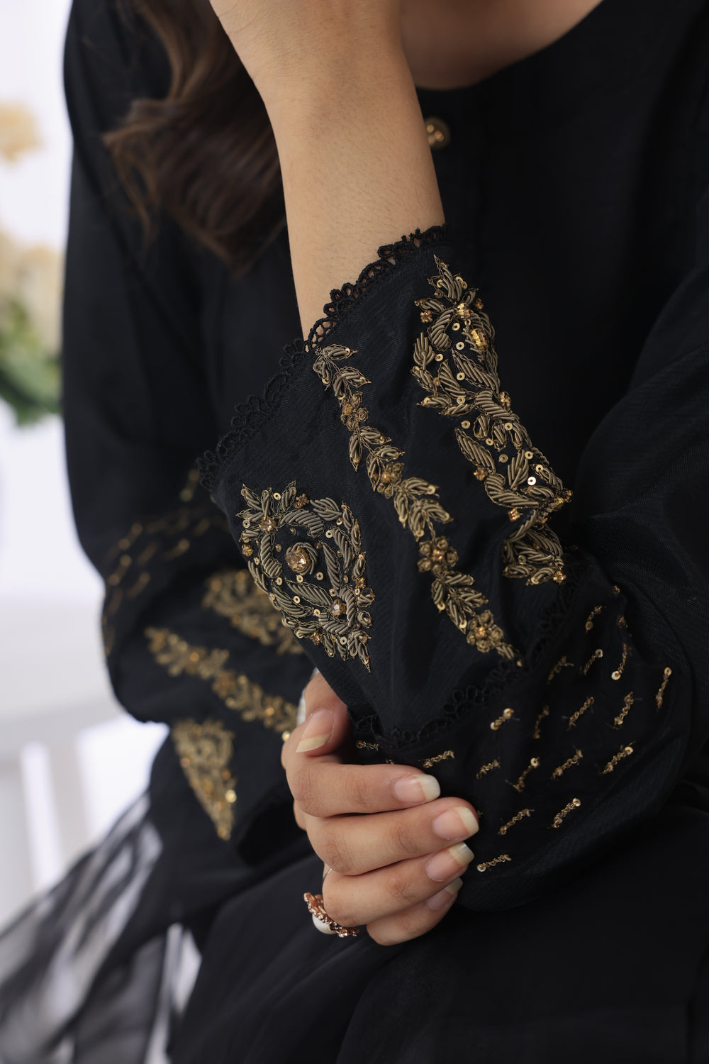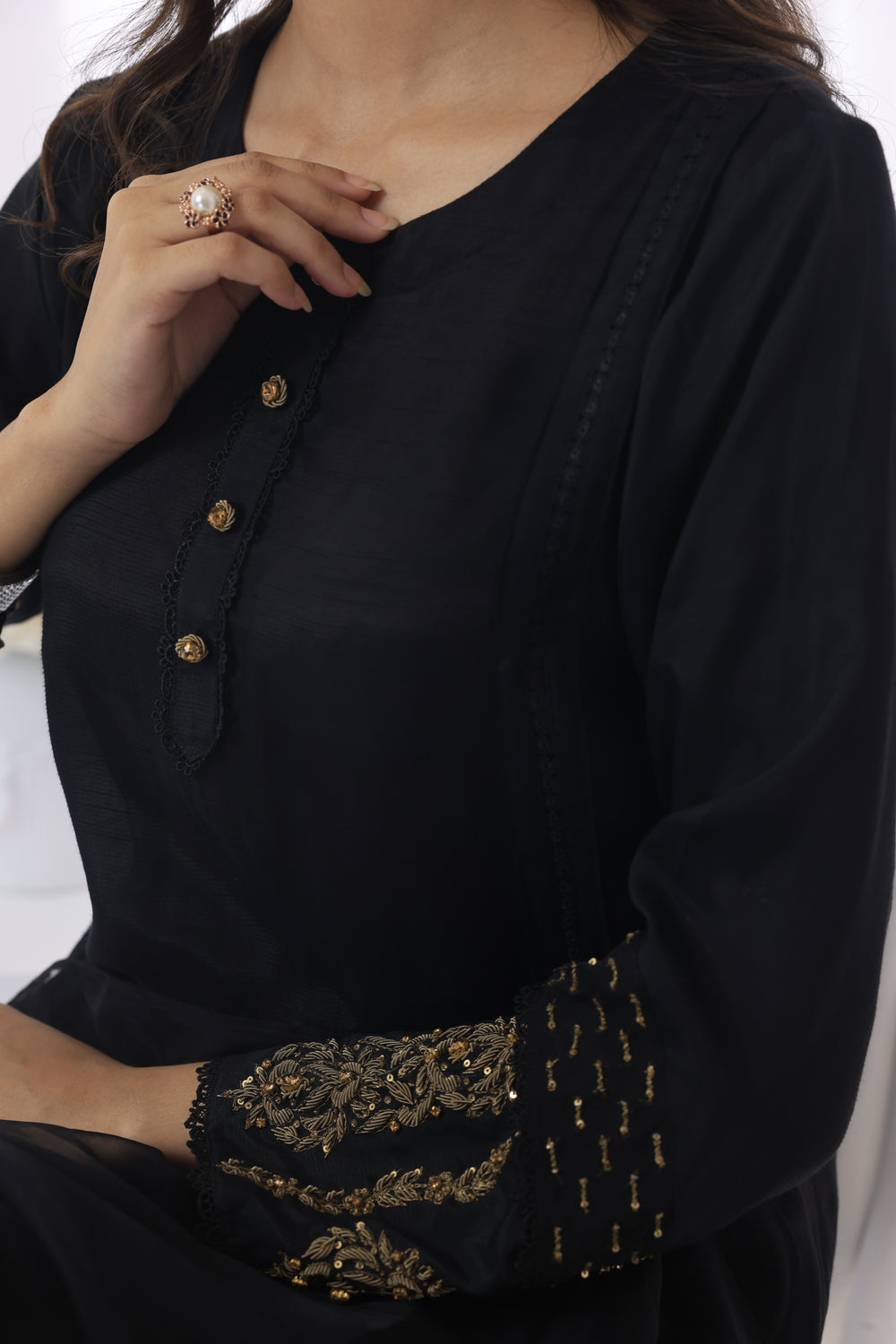 "Mystic Noir" is an alluring ensemble crafted with black raw silk. The shirt cuts and delicate laces accentuate the silhouette, and the hand-embellished details of Kora Dabka, Naqshi, sequences, and moti add a touch of opulence. The sleeves feature attached embellished organza patches with intricate Zari stitches, creating a striking contrast. The organza dupatta completes the ensemble with Zari adorning the pallu, adding a touch of elegance and sophistication.