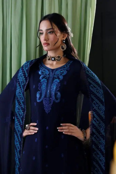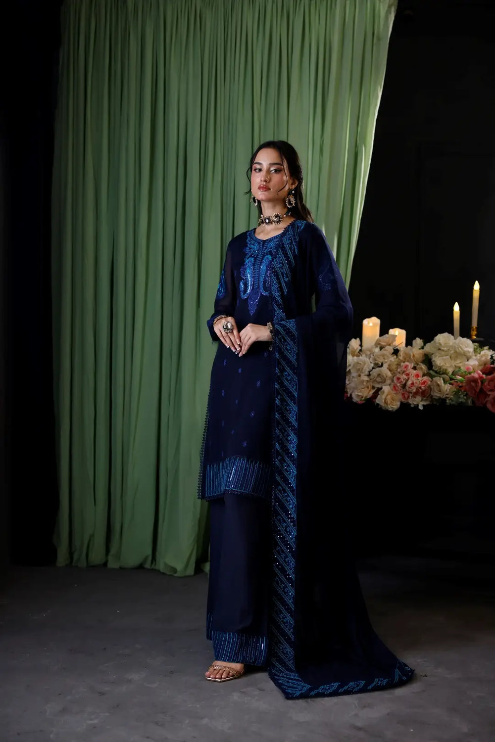 Style this midnight blue ensemble with statement earrings and a sleek bun for a regal look. Pair it with metallic heels and a matching clutch to enhance its festive charm.
