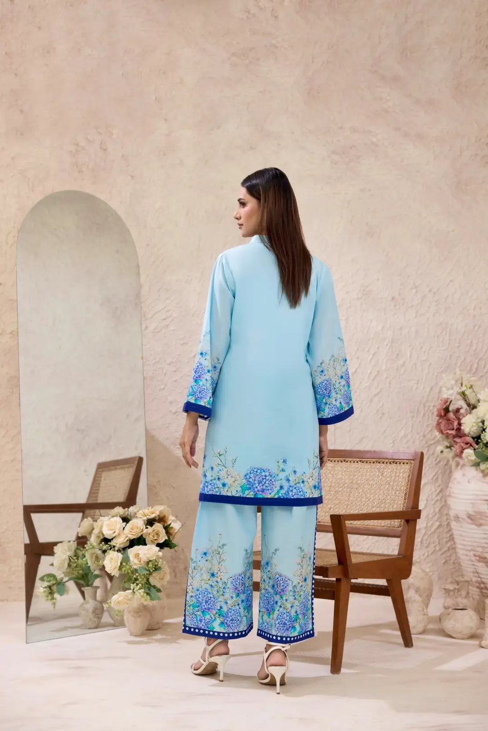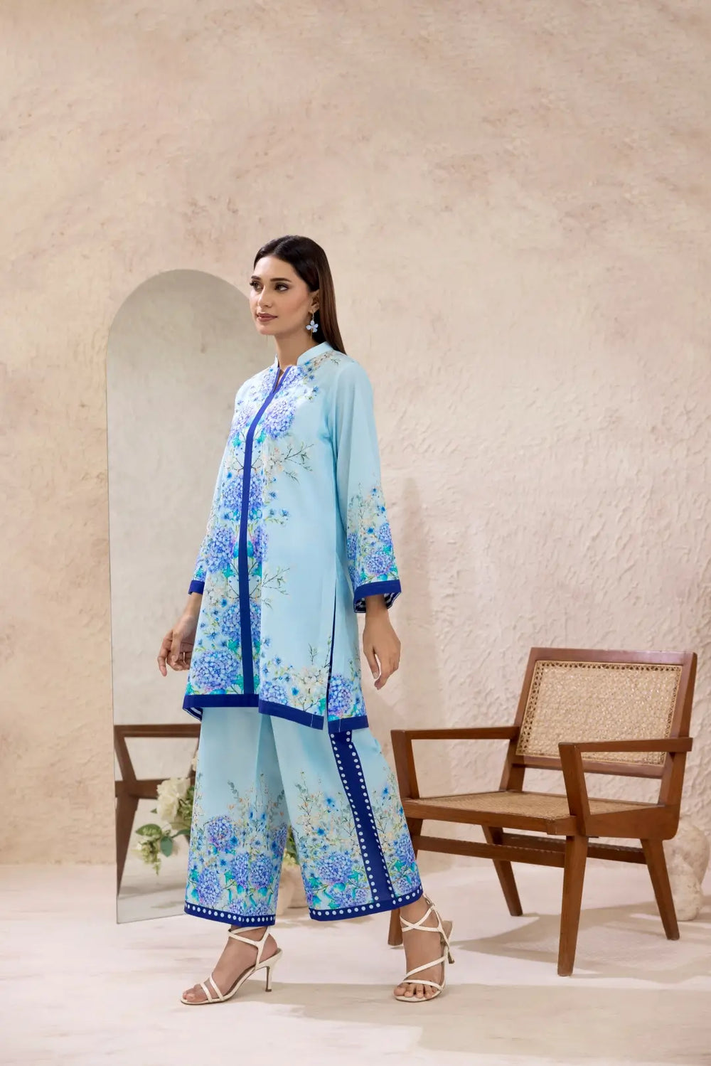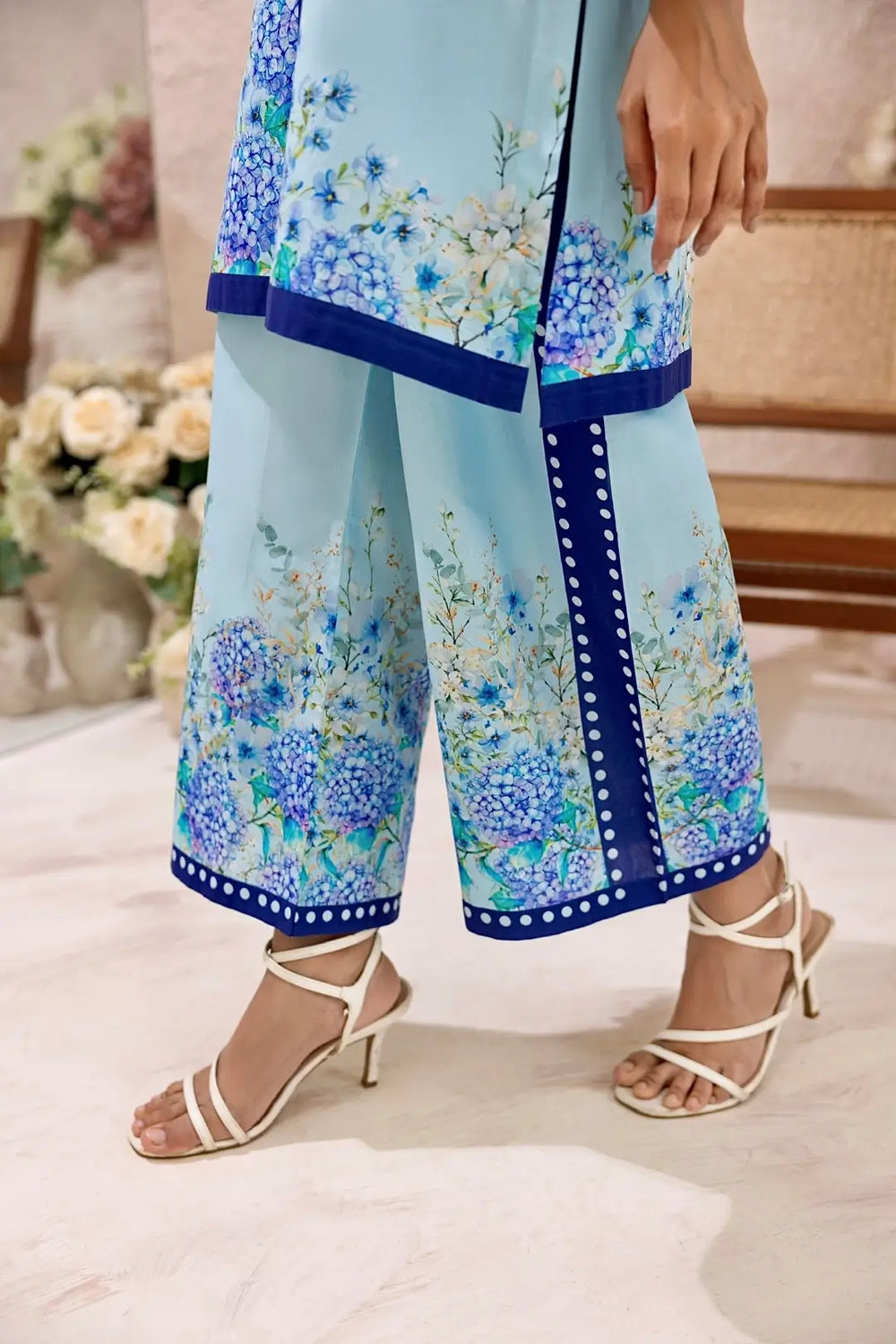 A short Printed cambric shirt with a collared neckline and flared sleeves offers easy elegance in a modern blue hue. Paired with wide-leg trousers, the loose-fit silhouette ensures all-day comfort and coordinated charm.