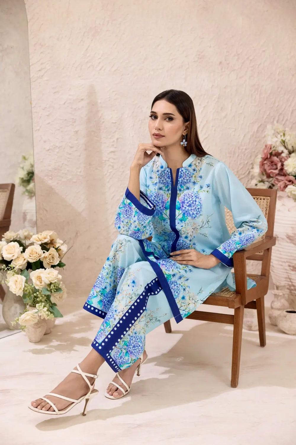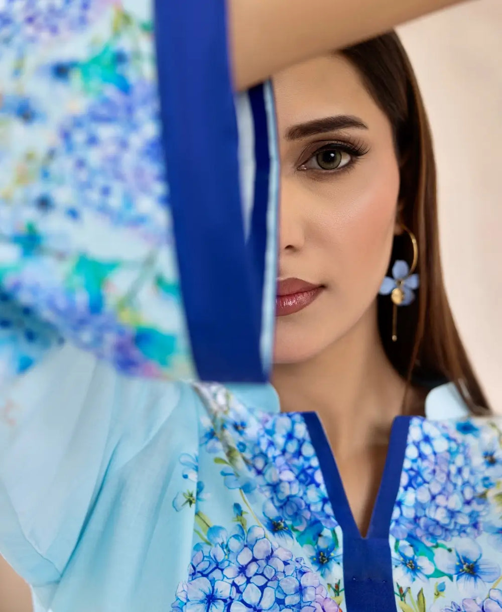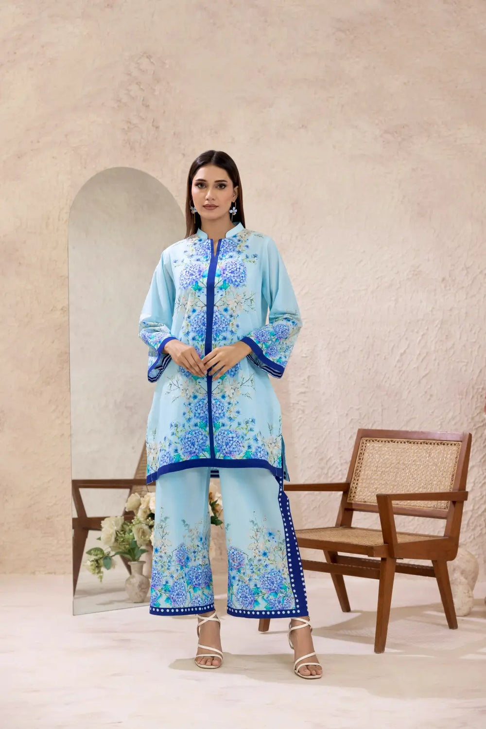 A short Printed cambric shirt with a collared neckline and flared sleeves offers easy elegance in a modern blue hue. Paired with wide-leg trousers, the loose-fit silhouette ensures all-day comfort and coordinated charm.