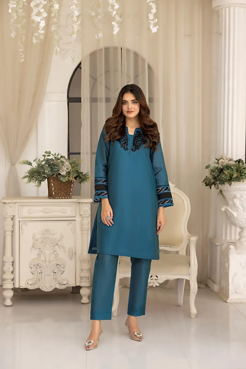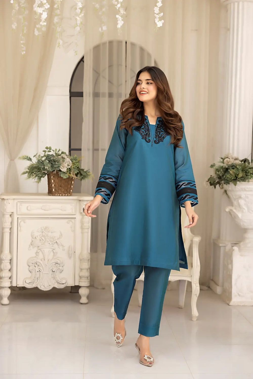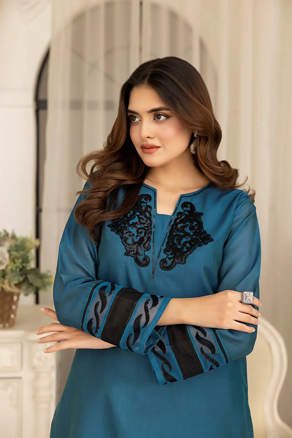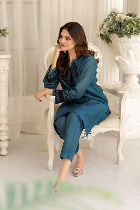 Crafted from luxurious Sheesha silk, the long teal shirt features intricate black sequin embroidery on the neckline, creating a striking contrast against the rich hue. Delicate embroidery on the sleeves enhances its elegance, while sleek straight pants provide a modern, streamlined silhouette — a perfect balance of timeless charm and contemporary sophistication.