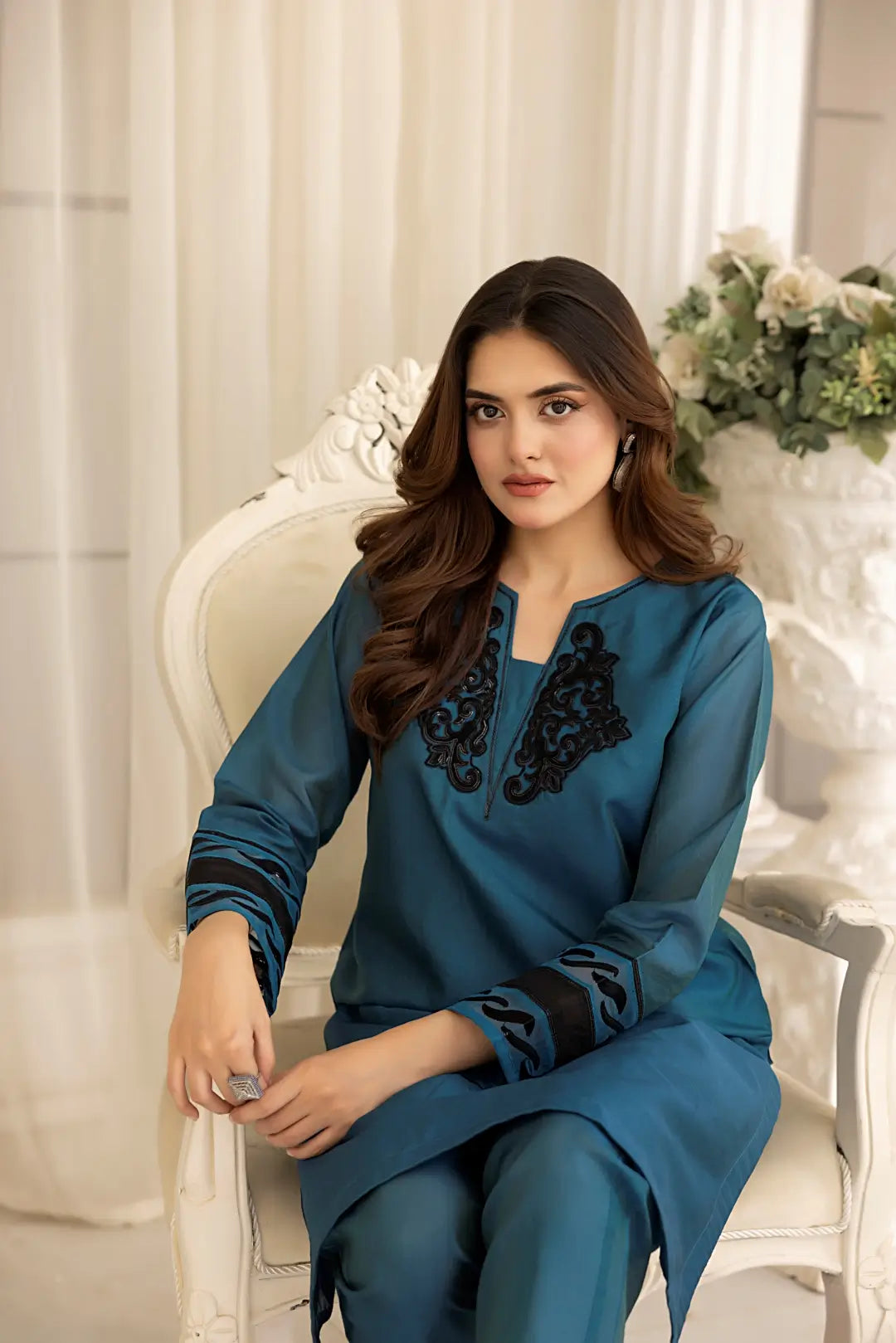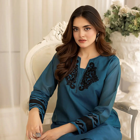 This graceful teal long shirt features intricate black sequin embroidery on the neckline, creating a striking contrast against the rich hue. Delicate detailing and embroidery on the sleeves add a touch of elegance, enhancing its refined appeal on luxurious sheesha silk. Paired with sleek straight pants, this ensemble is a perfect blend of sophistication and timeless charm.