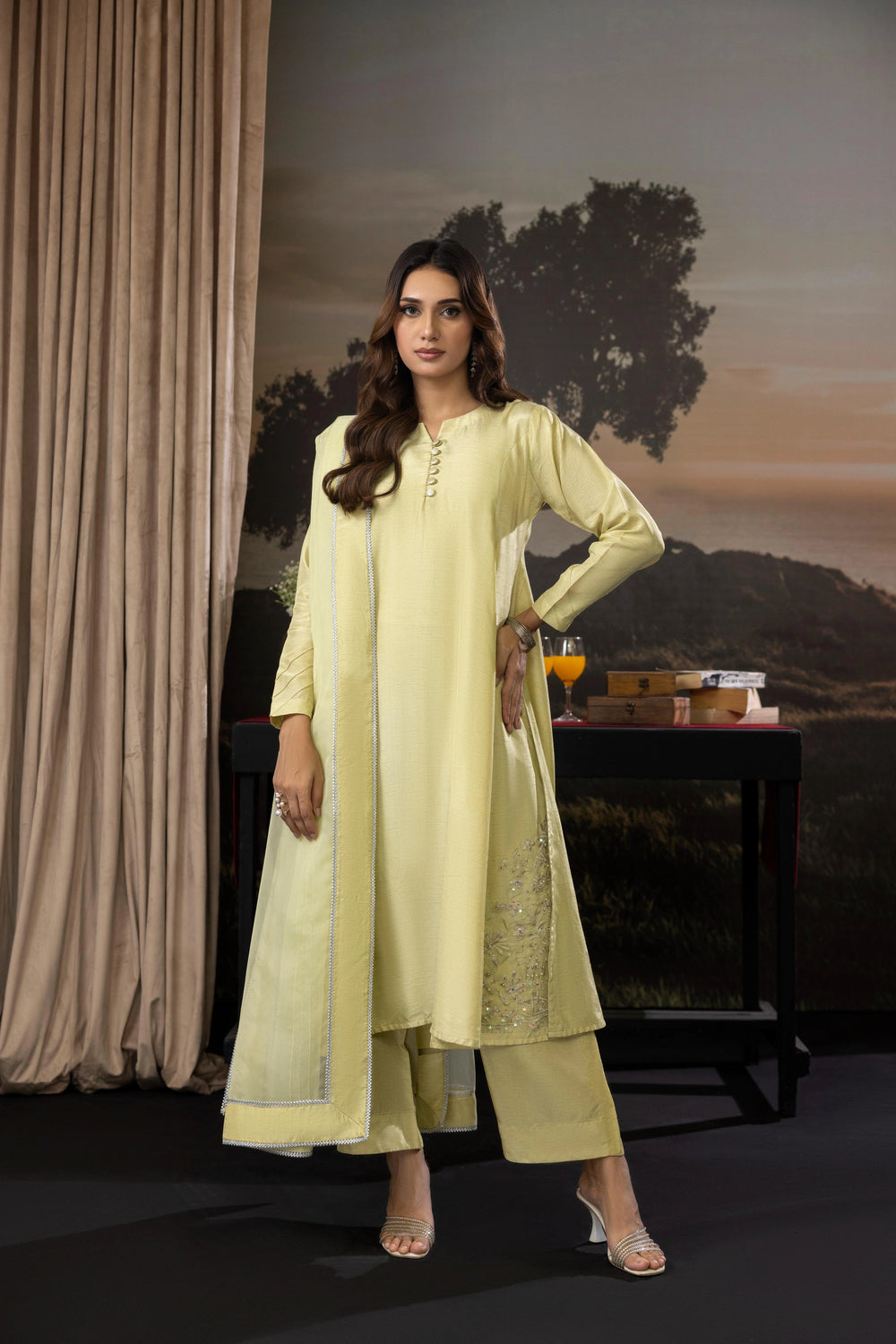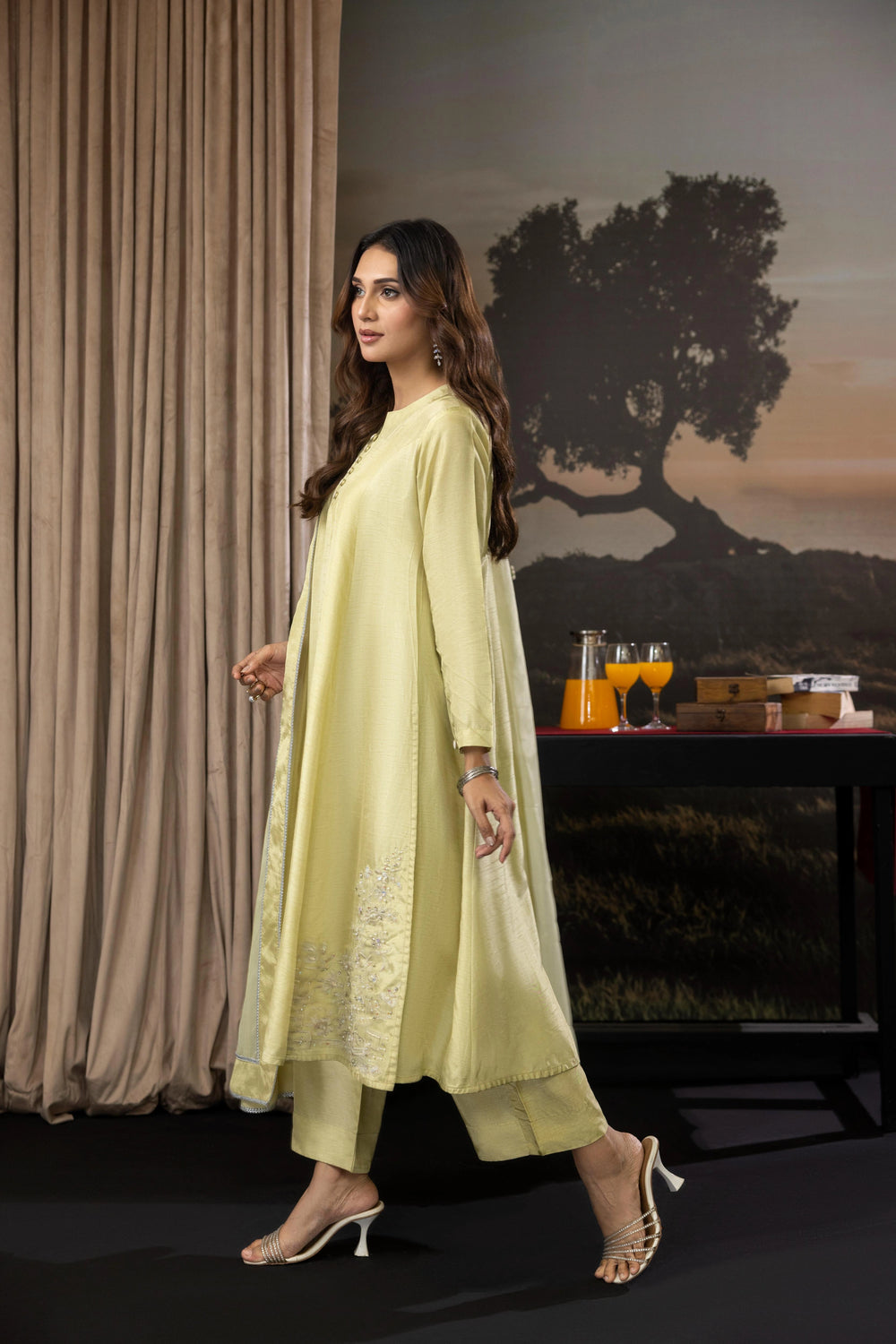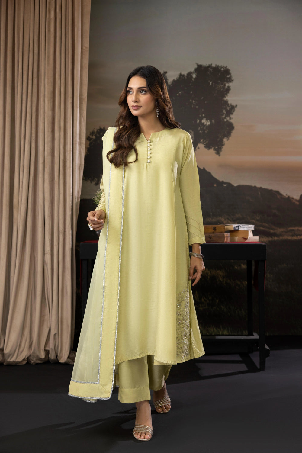 A sophisticated 3-piece raw silk outfit featuring a mid-length shirt with front panels, paired with culotte pants and an organza dupatta. Perfect for a relaxed yet elegant festive look.
