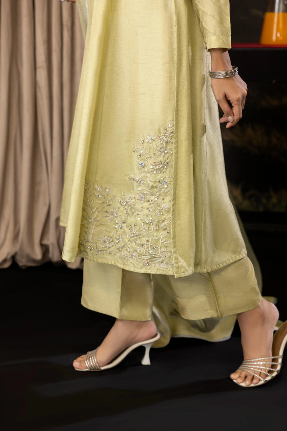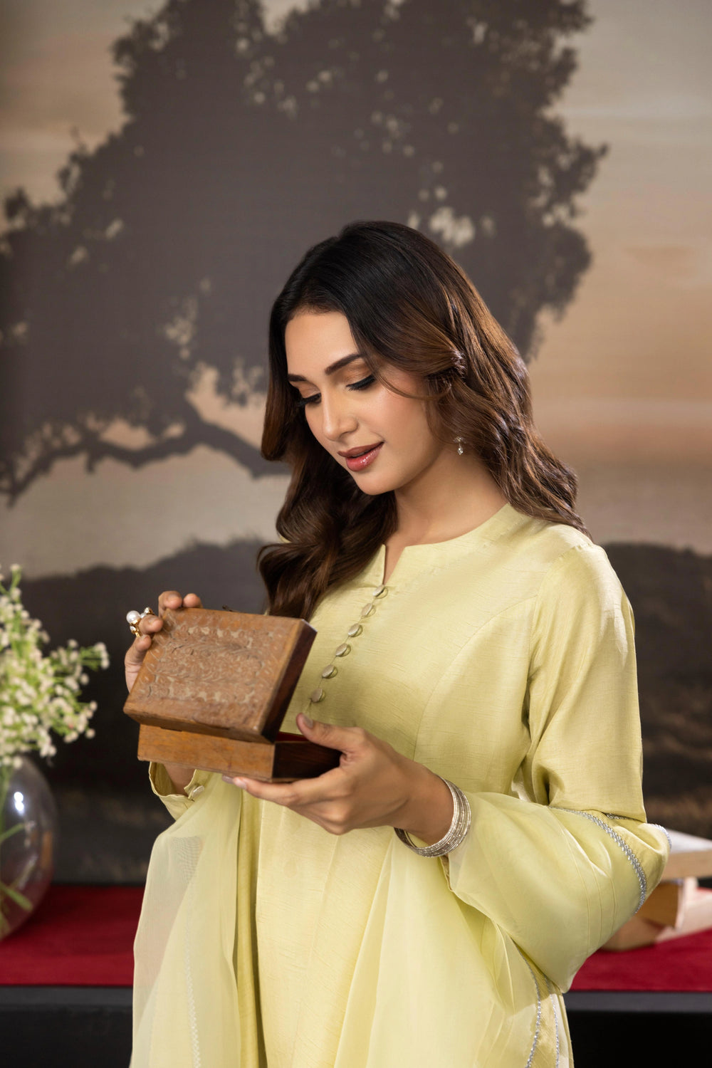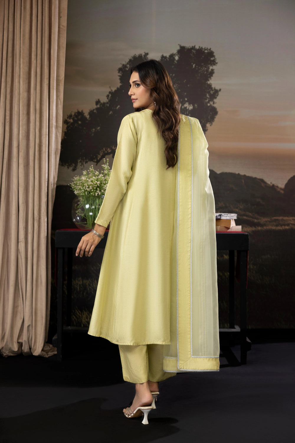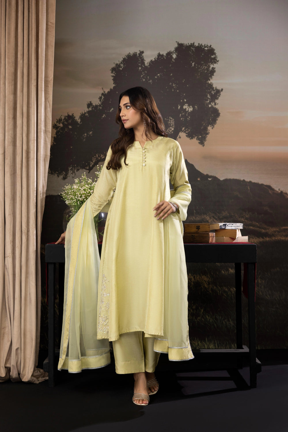 A sophisticated 3-piece raw silk outfit featuring a mid-length shirt with front panels, paired with culotte pants and an organza dupatta. Perfect for a relaxed yet elegant festive look.