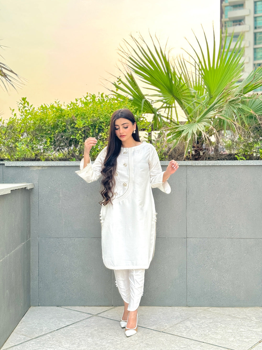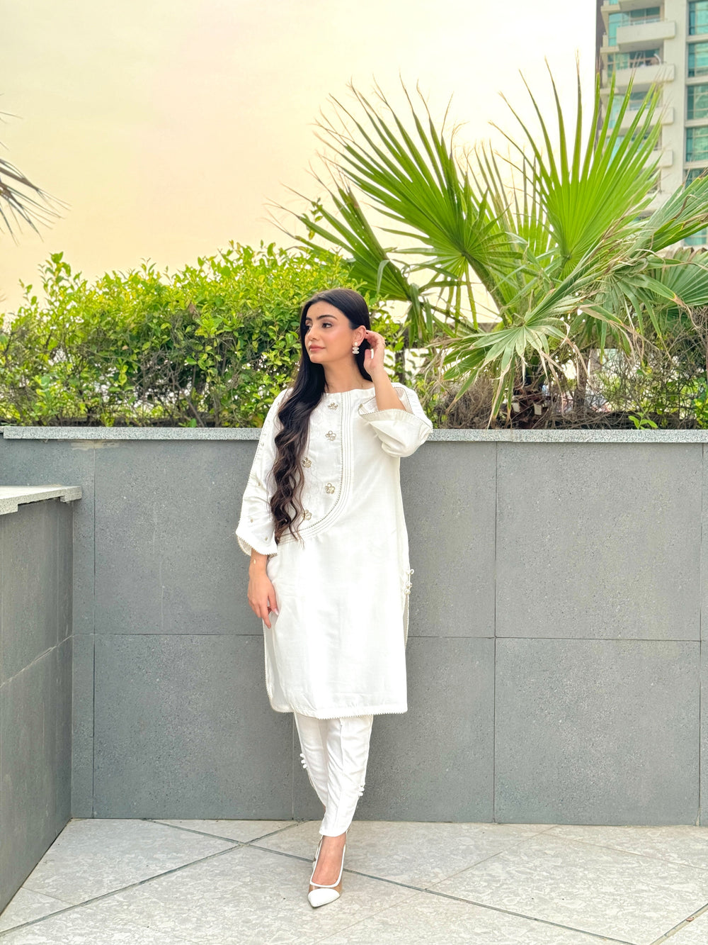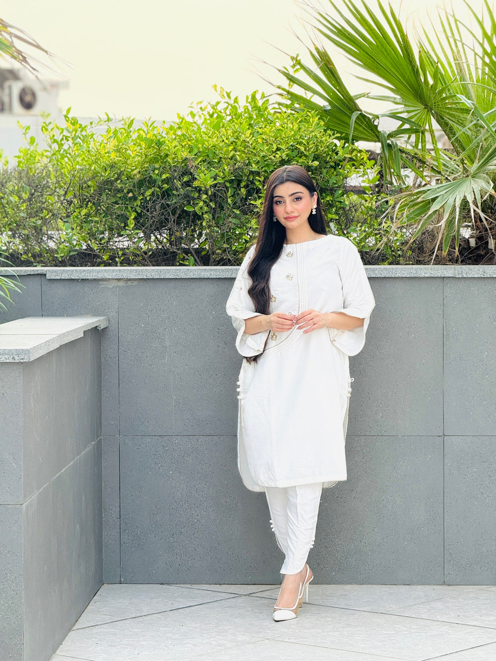 This 2-pcs article has straight shirt with round daman, boat shaped neckline and tulip sleeves. Semi-circle cut at bodus decorated with zari & sequence (adda work) hand embroidery, running stitch and lace also showcasing the beauty of article. Buttons used at chalk, embellished with adda work to enhance the detailing. Also added tulip pants.