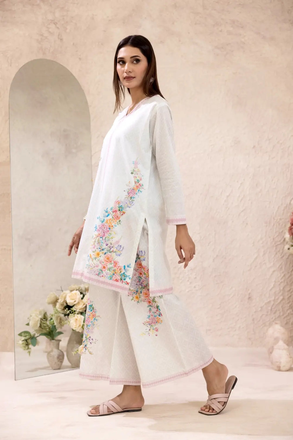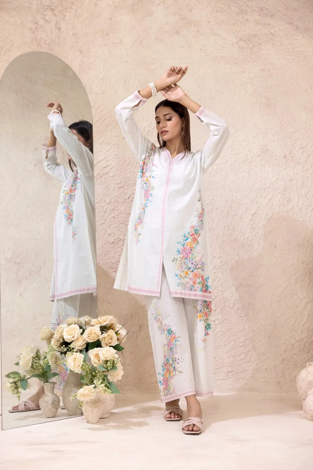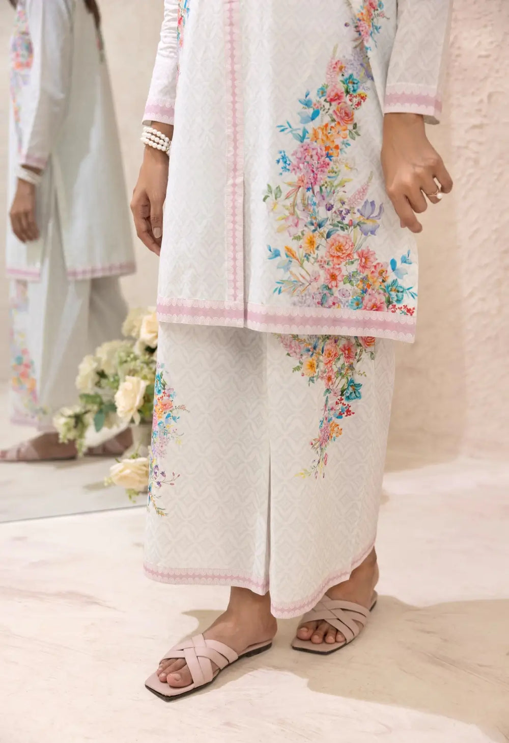 This Printed cambric two-piece features a knee-length, front-open shirt with a flattering V-neckline, styled in a loose fit for relaxed elegance. The look is finished with fitted sleeves that balance the flowy cut, while wide plazzo pants add movement and ease.