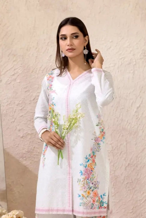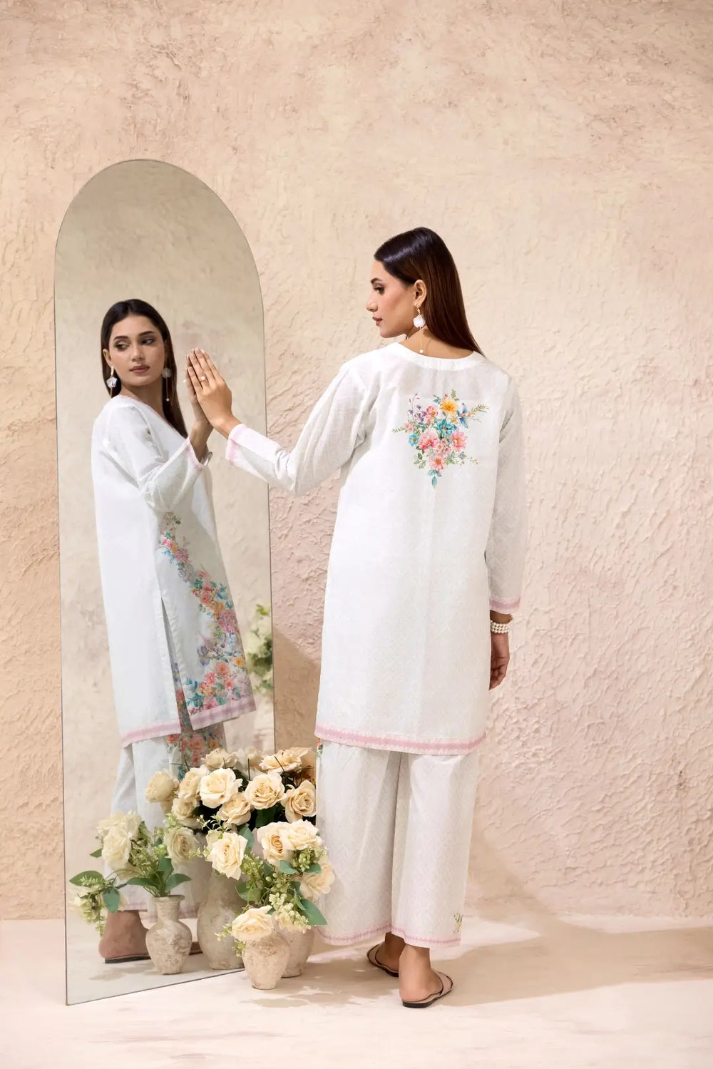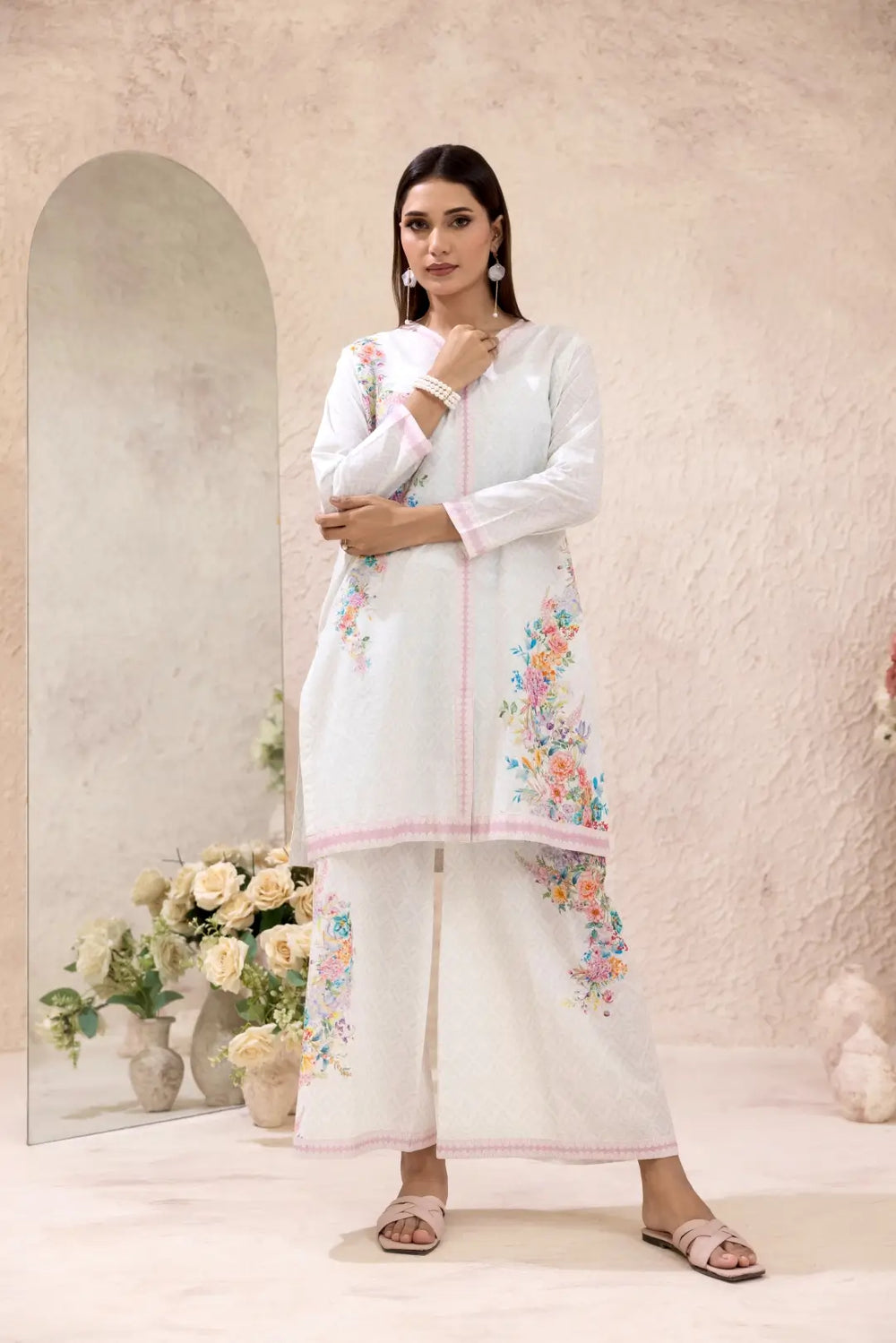 This Printed cambric two-piece features a knee-length, front-open shirt with a flattering V-neckline, styled in a loose fit for relaxed elegance. The look is finished with fitted sleeves that balance the flowy cut, while wide plazzo pants add movement and ease.