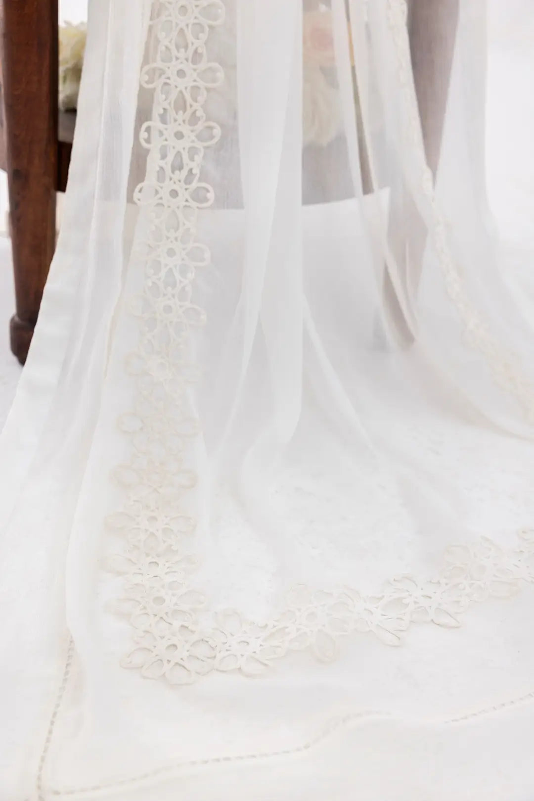 White embroidered dupatta with lace detailing on premium crinkle chiffon.